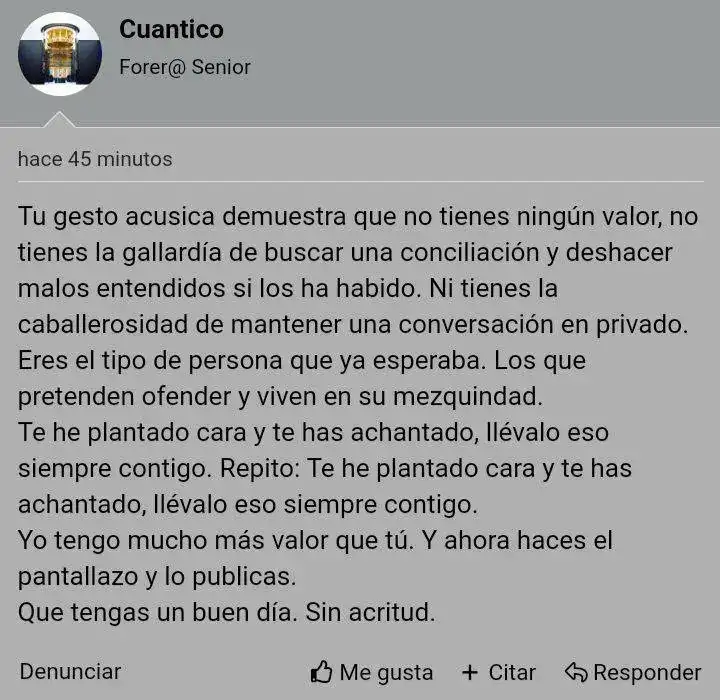 Disculpe pero yo llevo aquí tan poco tiempo como ud., no tengo el gusto de ser amigo de nadie en el foro (aunque creo recordar haber dado "me gusta" a varios de sus mensajes) y, sin embargo, mi valoración de lo sucedido hubiese sido mucho más severa que la del moderador.es raro q siempre la reprimenda la sufren los mismos... yo tb llevo poco y ya me voy dando cuenta de como os las gastais x aki... parece q es mejor estar cayadito como en tiempos preteritos...