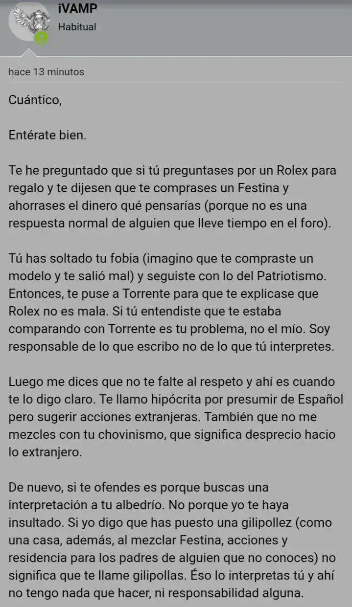 Igual es la primera vez que haces un comentario de tan mal gusto como lo de "cuando metas a tu padre en una residencia". En cuanto a lo del Rolex vs Festina... en serio te tomas la molestia de escribir para eso?Estoy en cinco foros entre relojes y estilográficas y es la primera vez que me pasa esto, la primera vez que ignoro a un usuario. Cierto que me lo vi venir otras veces, que venía esquinao y debí evitarlo. Pero no se puede huir siempre. Botón "Ignorar" y espero que no pueda leer mis mensajes así como yo no los suyos. Y punto final.