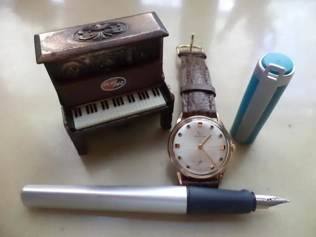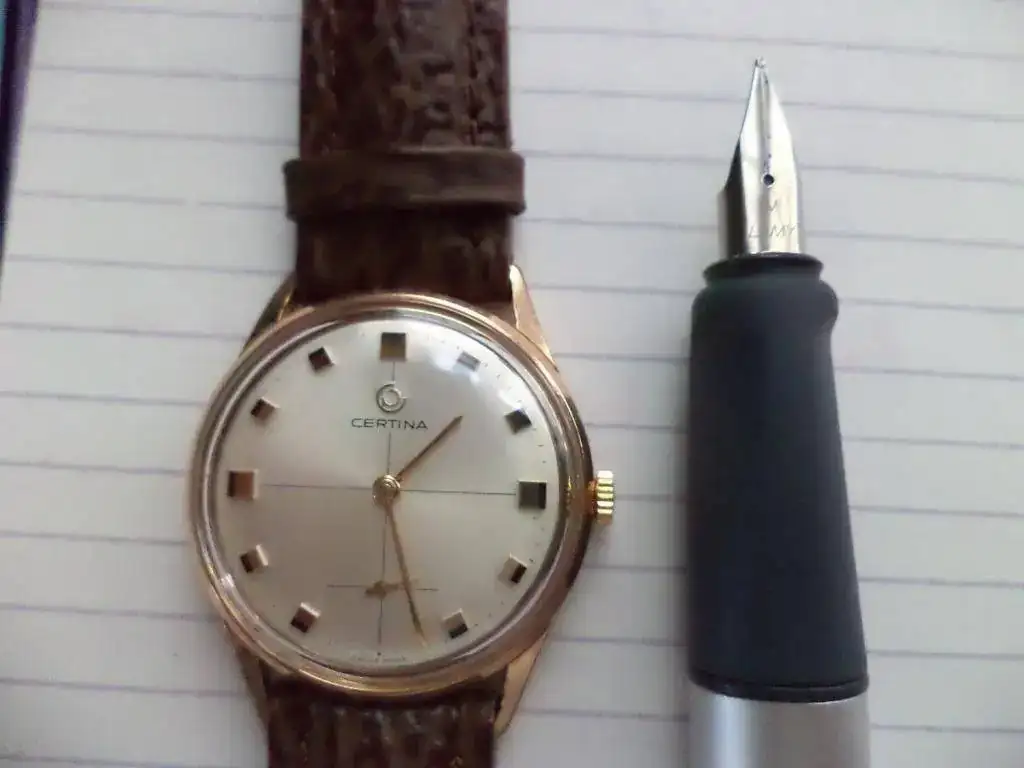 Y abajo: Certina calibre 28-10 y pulsera trenzada celeste y blanca; sacapuntas Playme y Lamy en foto final: