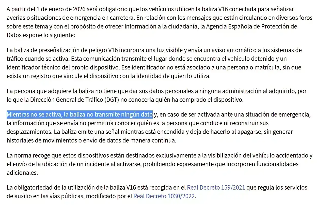 Pues yo veo que la Agencia de Protección de Datos ha publicado una nota informativa sobre las balizas v-16: