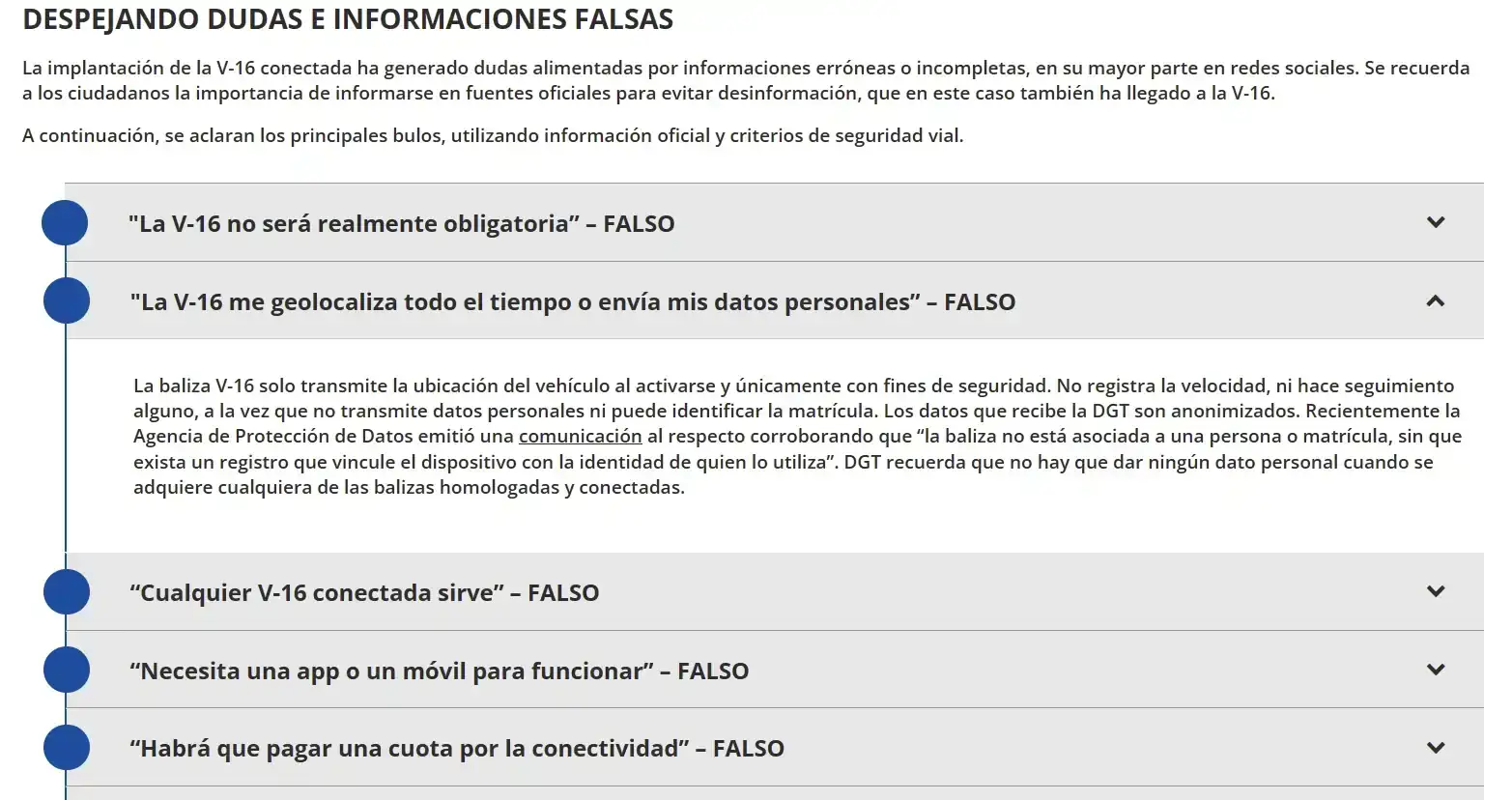Por otro lado, la DGT también tiene un apartado desmintiendo informaciones falsas sobre la baliza: