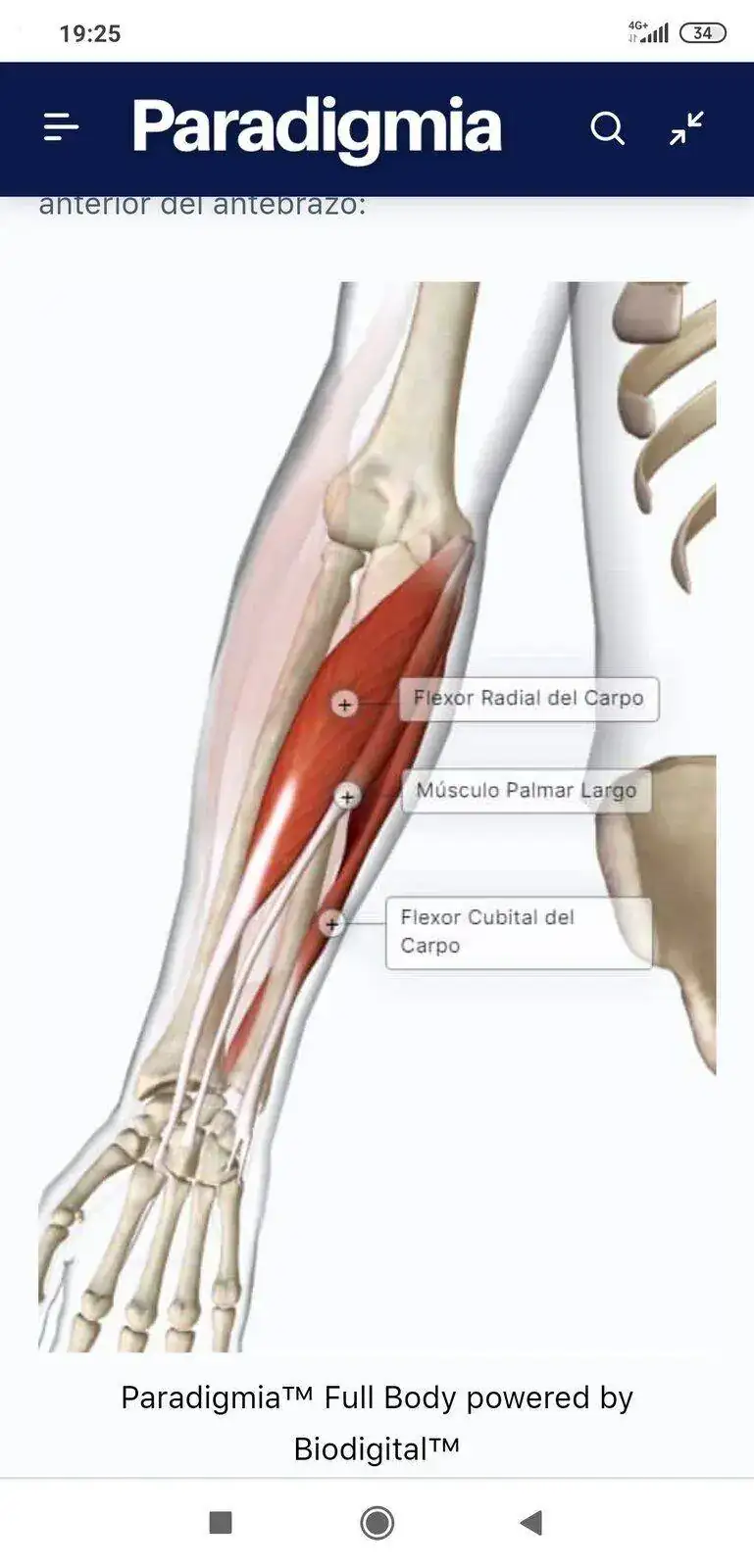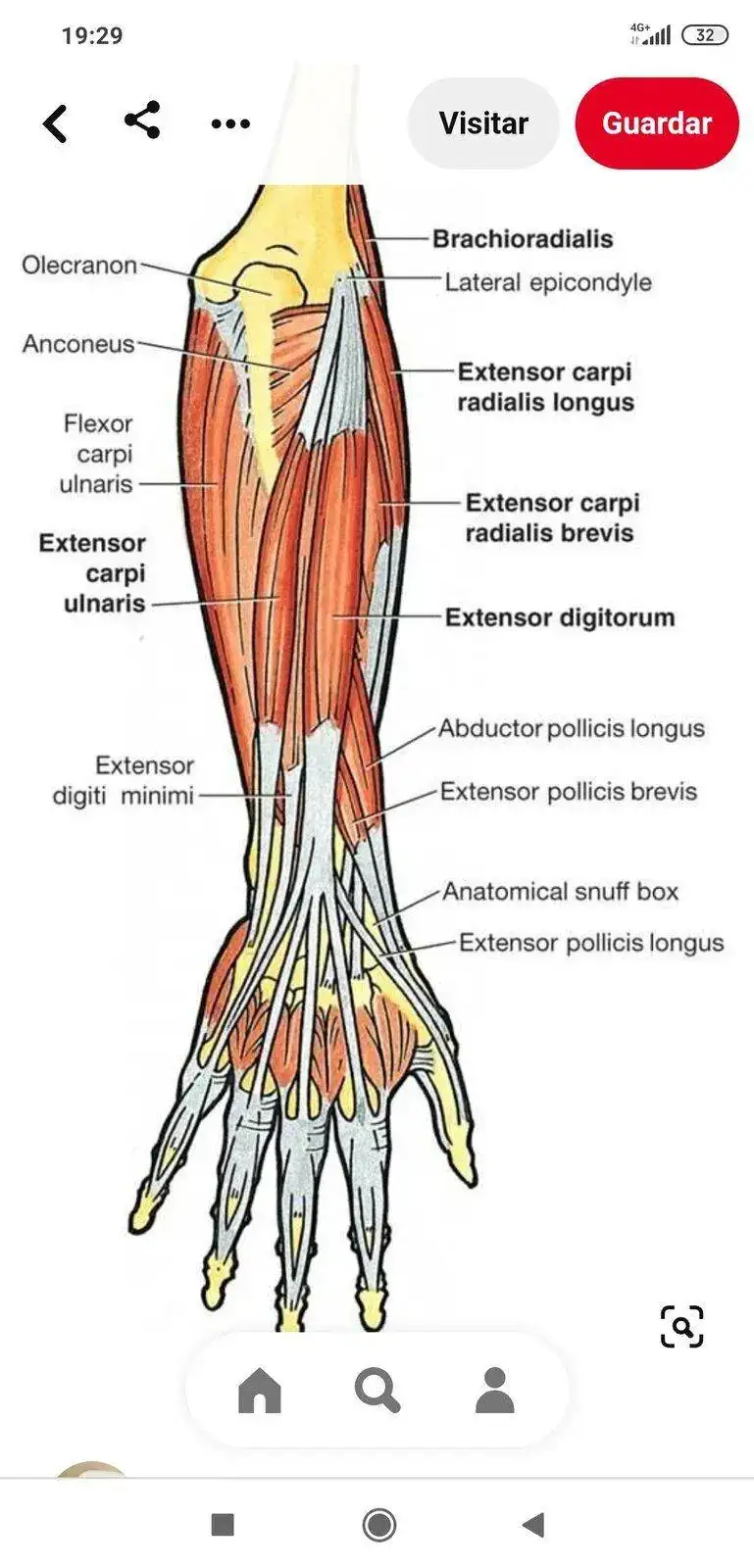 Anatomía de la muñeca. Puedes buscar el corte transversal que también es útil. En las muñecas no hay masa muscular que se pueda hipertrofiar. Llegan los extensores del antebrazo que se insertan entre el cúbito y el radio mediante múltiples tendones. Luego están las arterias, vasos sanguíneos, una finísima cada grasa y la piel.