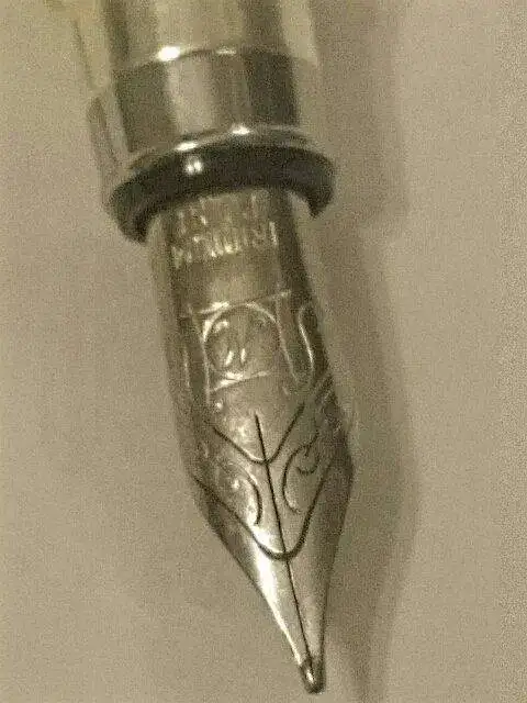 No te puedo decir mucho. Esa "M" en el plumín puede sugerir algo... Esta marca la he visto en bastantes sitios, aunque no recientemente, y te puedo asegurar que entran por los ojos. Las que recuerdo haber visto eran en resinas de colorines, rosas, violetas, verdes, etc. Todas muy monas. Paco Cruz (cruzaltpens) tiene actualmente una en su catálogo.
