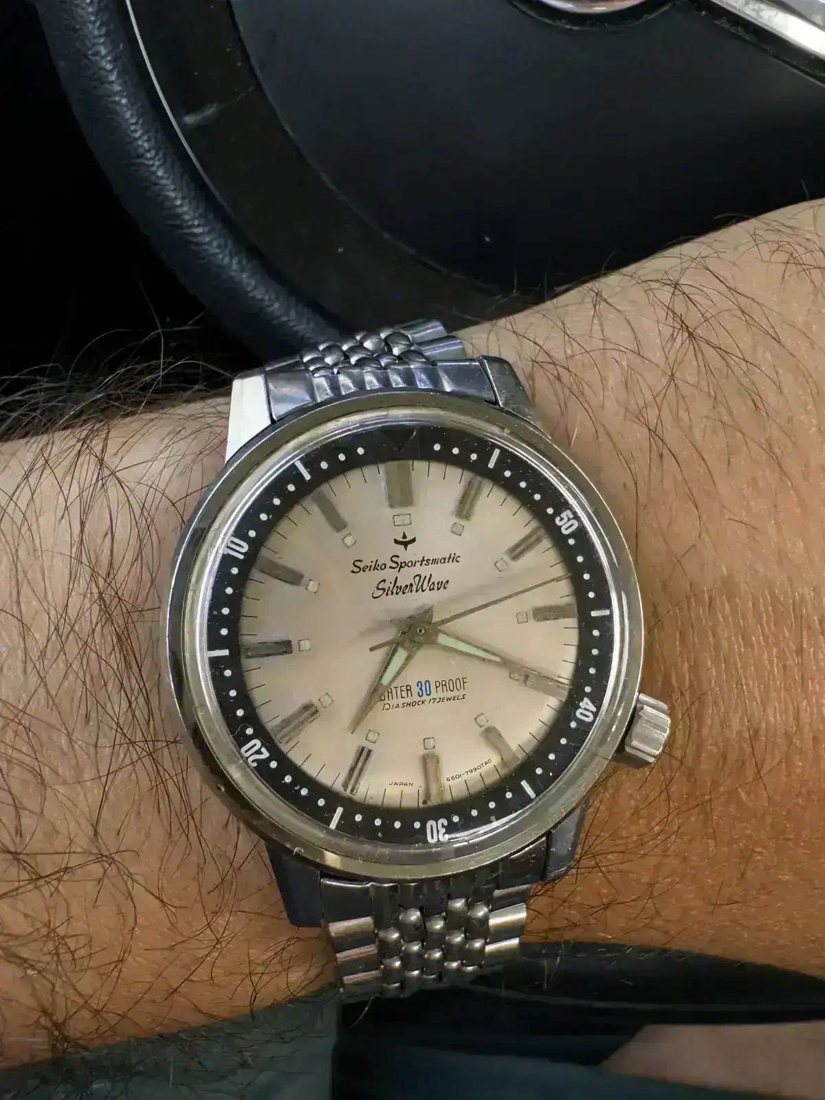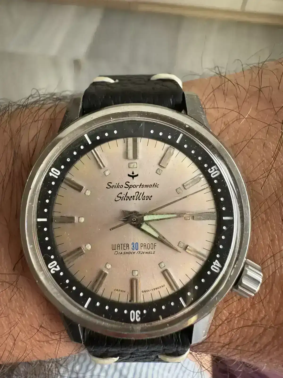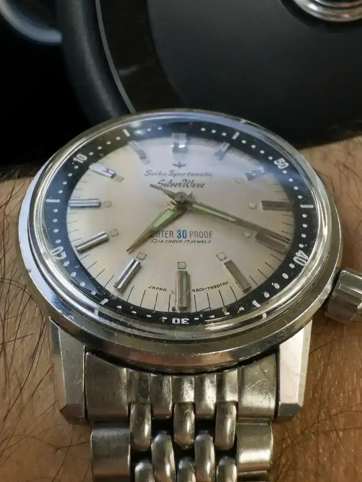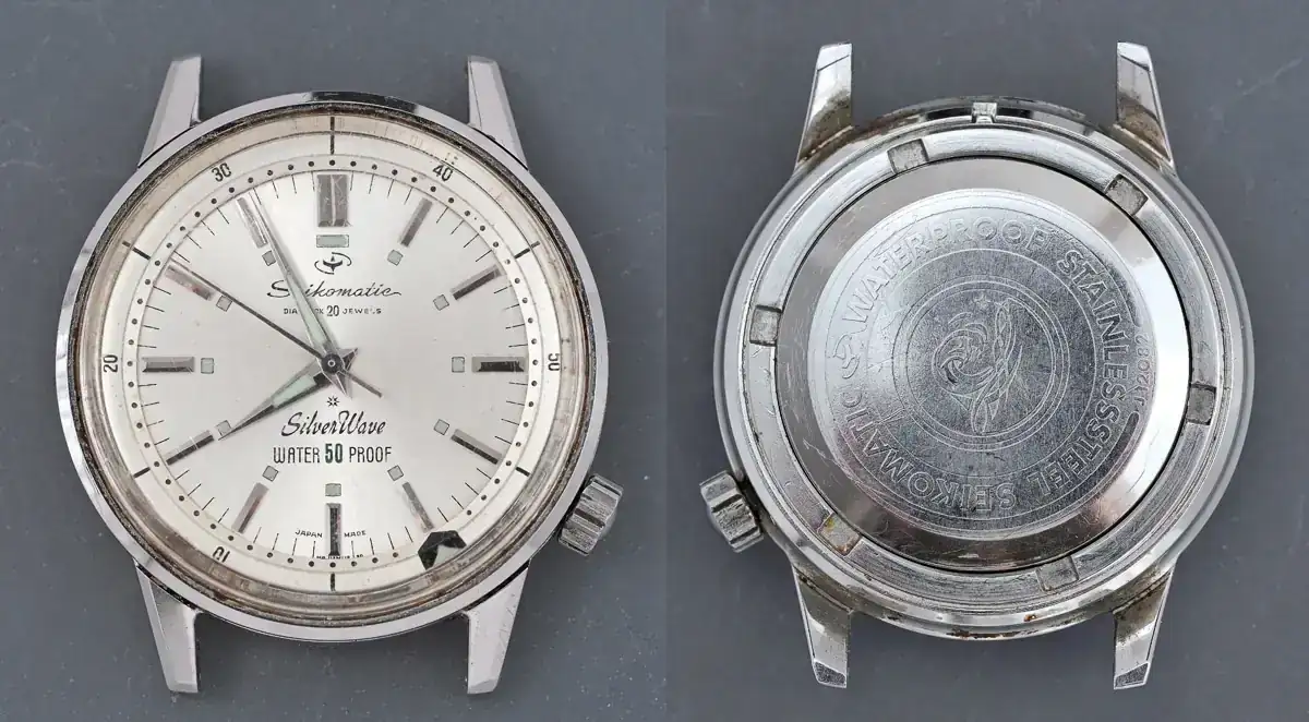 En 1961, Seiko lanza al mercado el primer SilverWave, con una resistencia al agua de 50 metros. Aunque no era un diver profesional, sí fue el primer reloj “de buceo” de la marca. Destacaba por su caja robusta de 37 mm, corona grande y cómoda a las 4 h, bisel interno giratorio bidireccional, fondo roscado e índices y agujas luminiscentes.