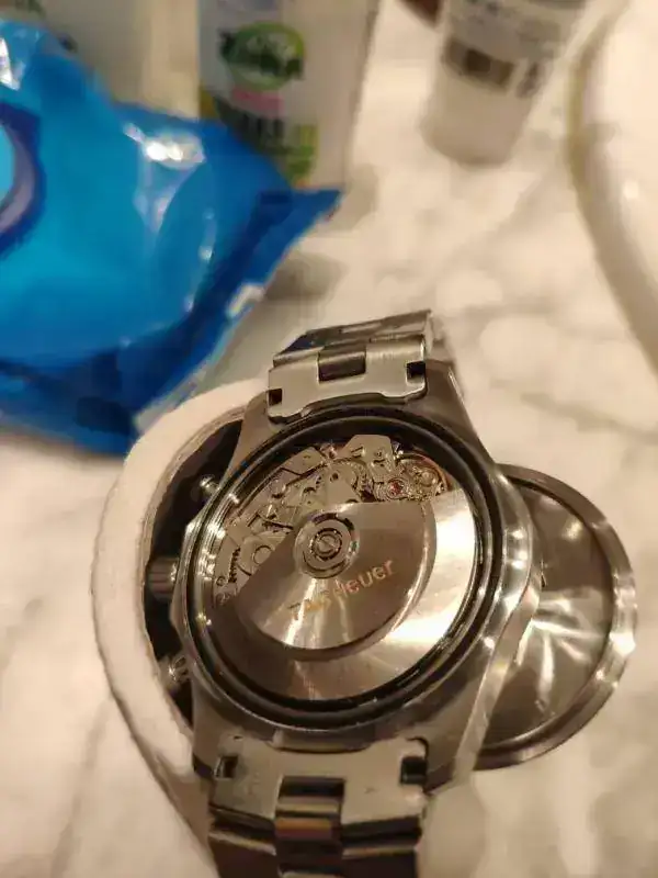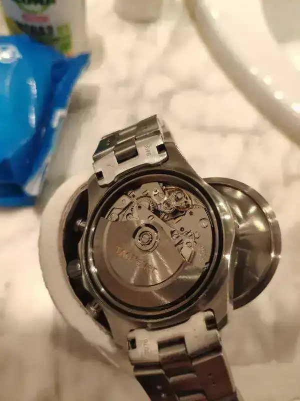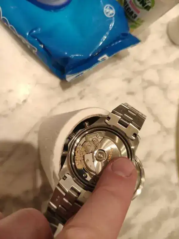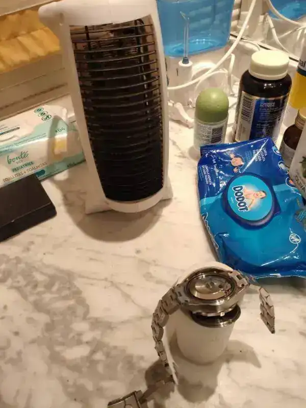 Las relojerías cerradas... A ver qué hago, me da miedo que haya llegado al calibre... He abierto la tapa y lo he puesto a 20 cm de un calefactor a nivel suave de calor...