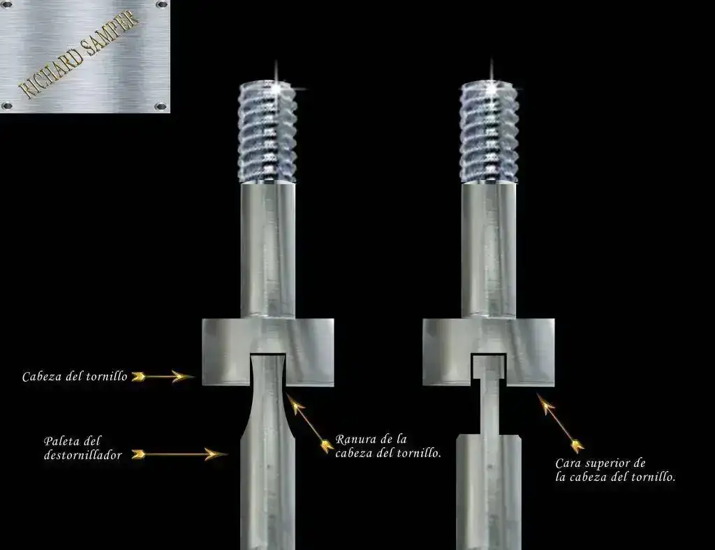 Seguramente el amable lector ya podrá haber percibido que la disposición de la punta del destornillador es particular. Con este corte de punta nos evitamos el riesgo de degenerar la cara de arriba de la cabeza del tornillo. De todas maneras; si os encontrais con un tornillo cuya cara de arriba de la cabeza tenga estos maltratos, lo podéis corregir, frotando la cara de arriba del tornillo maltrecho con un papel de lija 340. después que le hayamos corregido las asperezas, frotáis la cara de arriba de la cabeza del tornillo con una lija mucho más suave, como por ejemplo una lija 1200. Debéis extender el papel de lija en una superficie plana y ofrecer movimiento al tornillo no al papel de lija; un movimiento recto y firme, con cuidado que no salga volando el bendito tornillo jajajajjaa.