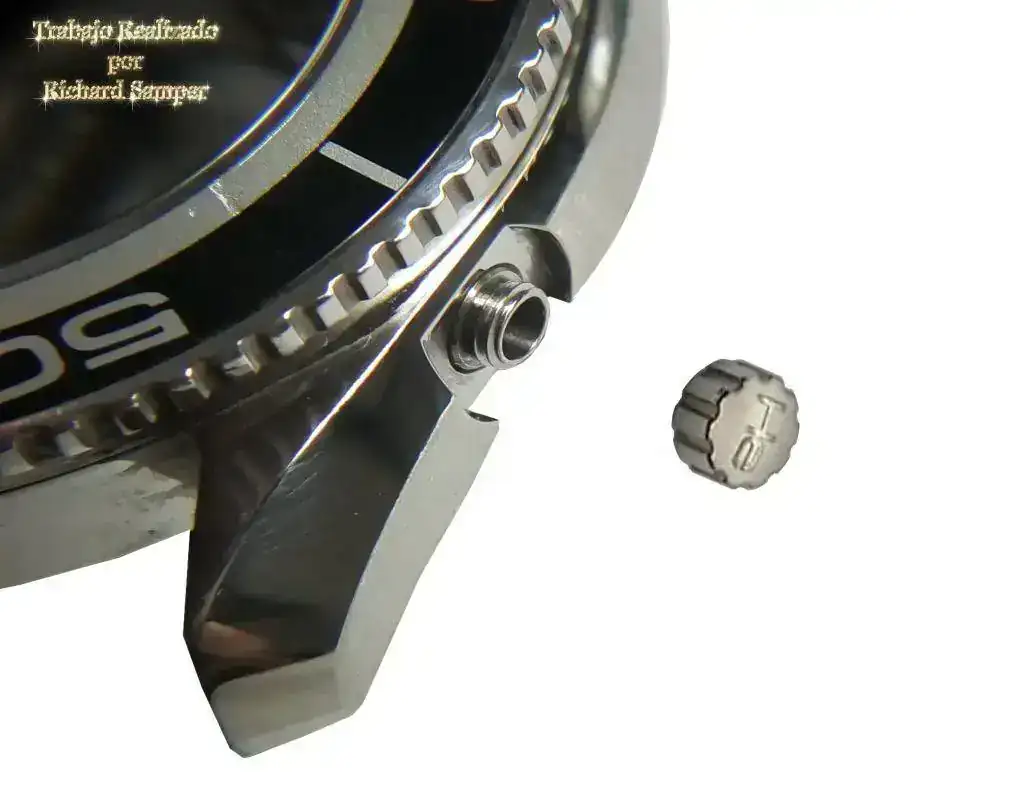 Por último, instalamos la coronilla y la enroscamos; pero antes le aplicáis un poquito de lubricante al empaque u-orin que está en el fondo de la corona, (sugiero molicote) o bien en final del tubo donde entra en contacto con el empaque u o-ring de la corona.