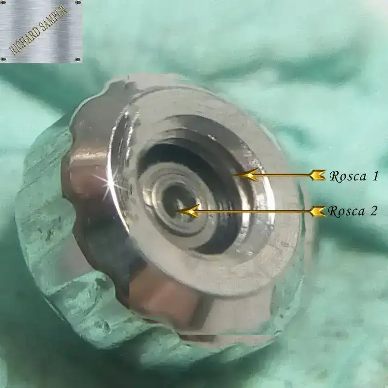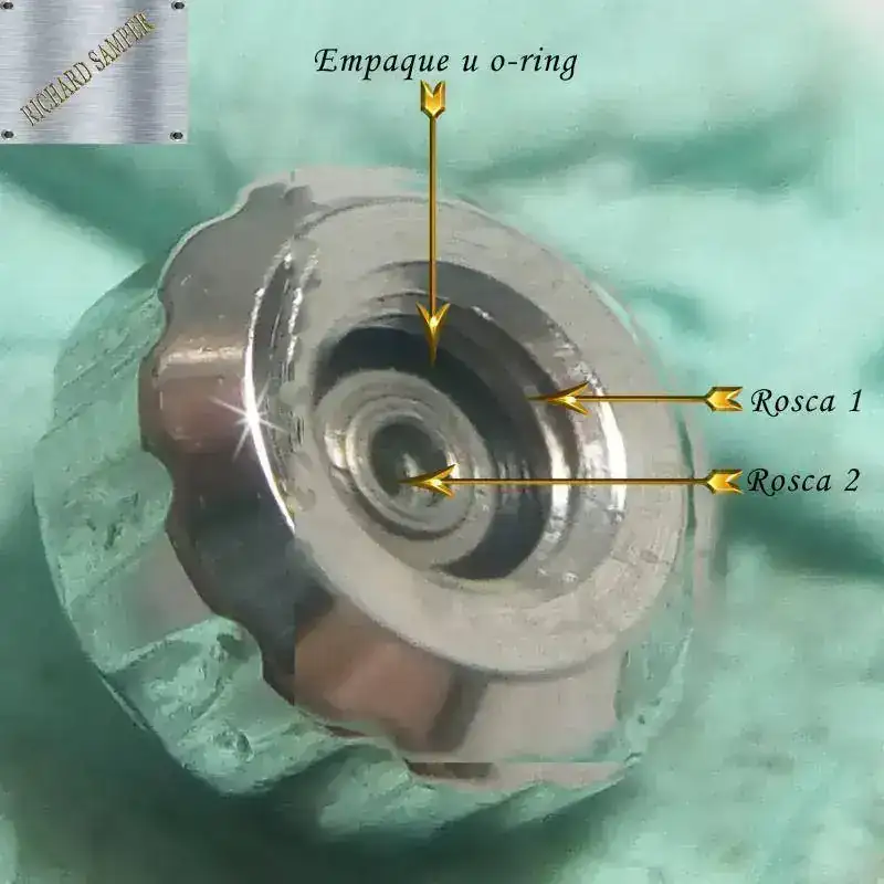 La rosca 1 es la que acopla por enroscamiento con la rosca que os describí en el tubo; y la rosca 2 es la que se acopla por enroscamiento con la rosca del tornillo. Cuando destornillamos el tornillo y la corona con respecto al tubo, habéis destrabado por completo todo. Lo primero que sacamos después de la corona es el resorte; el cual es el encargado de mantener a presión siempre hacía, afuera la coronilla. luego sacáis la arandela, la cual cumple la función de proteger al empaque de la fuerza que ejerce el resorte, de tal manera que el empaque no se maltrate; luego sacamos el empaque ú o-ring, el cual es el encargado de impedir la filtración (en el fondo de la corona también hay un elemento de estos). En estos momentos, lavamos todas estas piezas con bencina, las secamos, y entonces empezamos a armar el dispositivo. Observad algo importante que quizá sea importante aclarar.