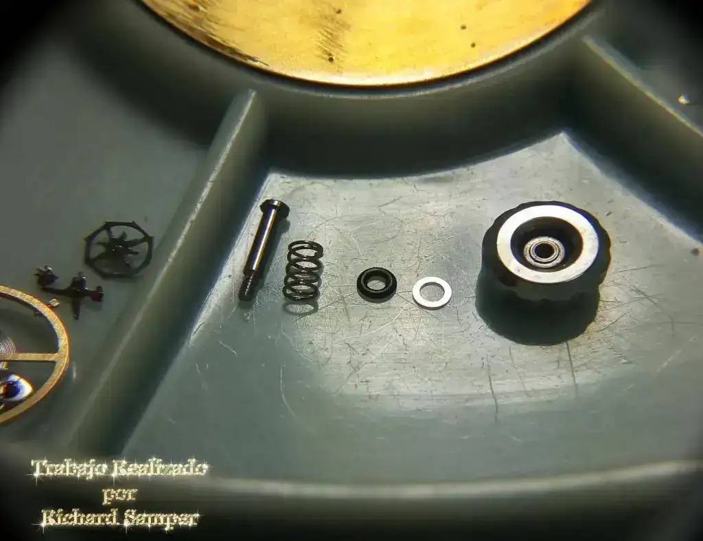 De por Dios por favor, colocad todo en un solo lugar para evitar que se os pierdan piezas. A todo relojero se nos han perdido elementos…el relojero que diga que no se la ha perdido nunca una pieza…”no le creo” … entonces reduzcamos al máximo la posibilidad de estos percances colocando todo con todo cuidado en un solo lugar. Ahora os comento algo; para lo cual os invito a apreciar la imagen subsiguiente.