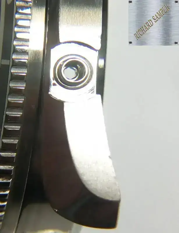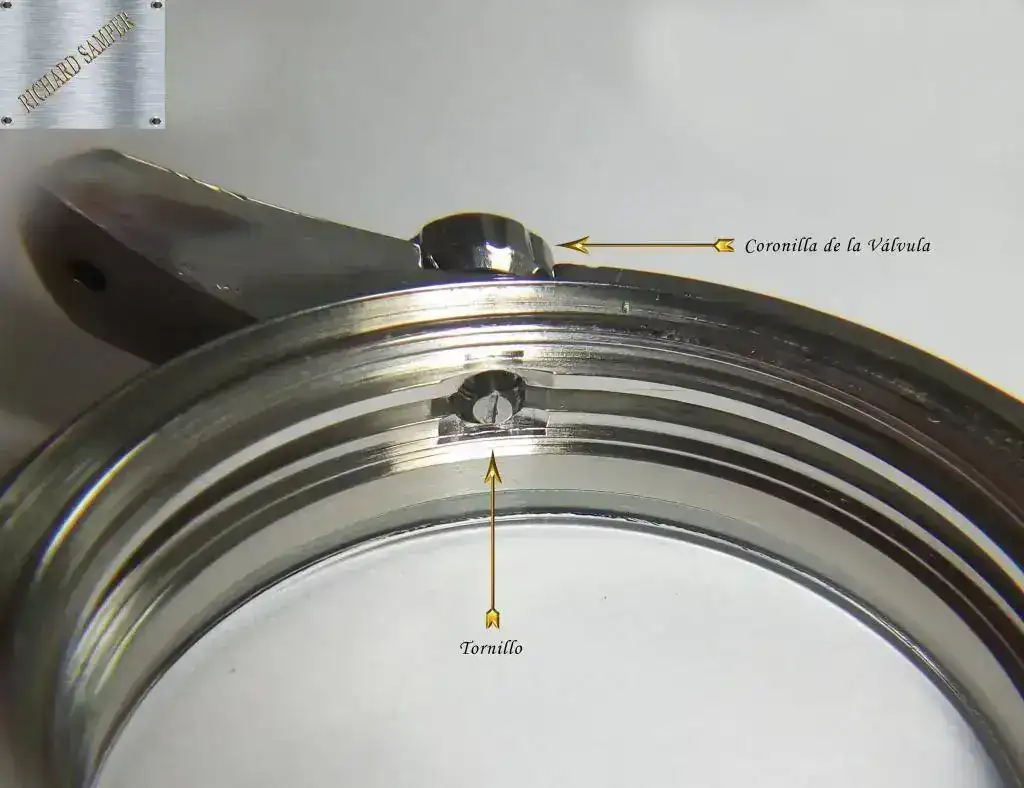 Para vosotros he desmontado la unidad motriz de este reloj (máquina, calibre, movimiento) y he tomado una foto de la parte interna de la caja de este reloj especificando la parte de la válvula manual de helio. Os invito a ver la imagen subsiguiente.
