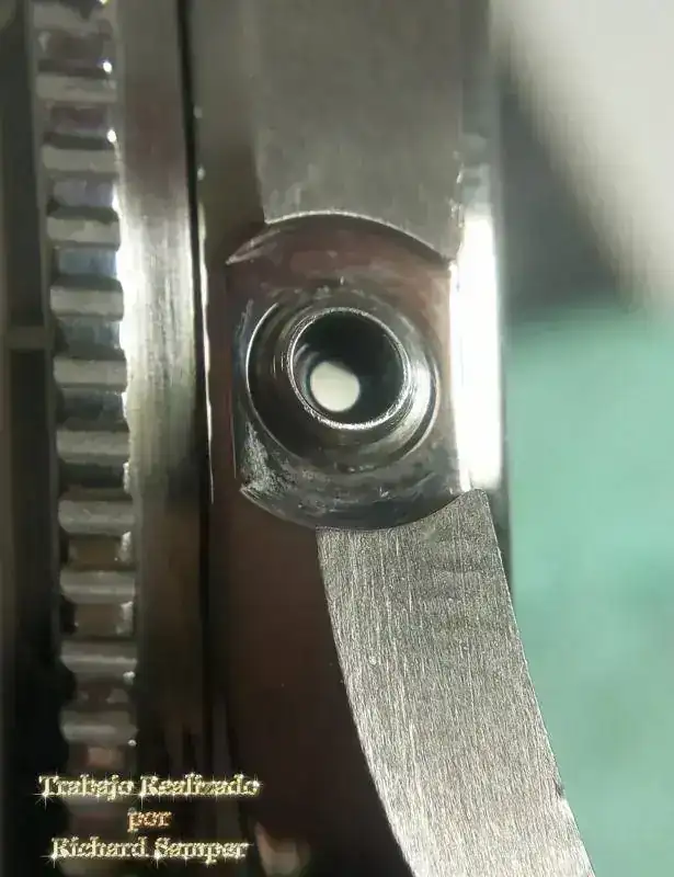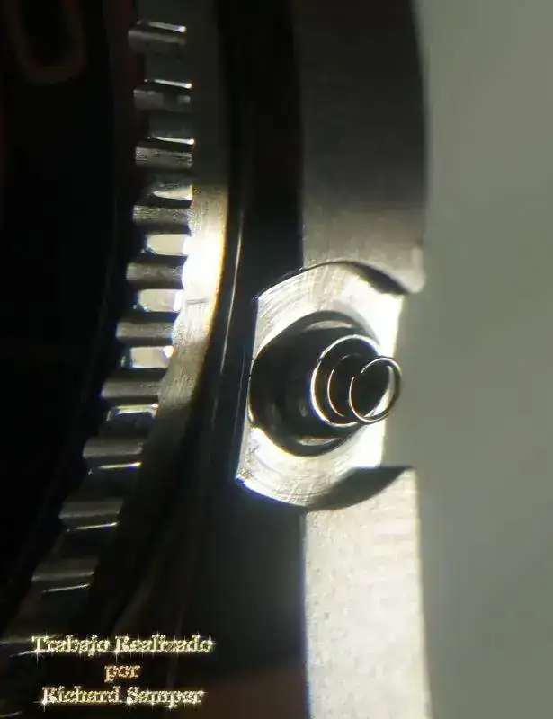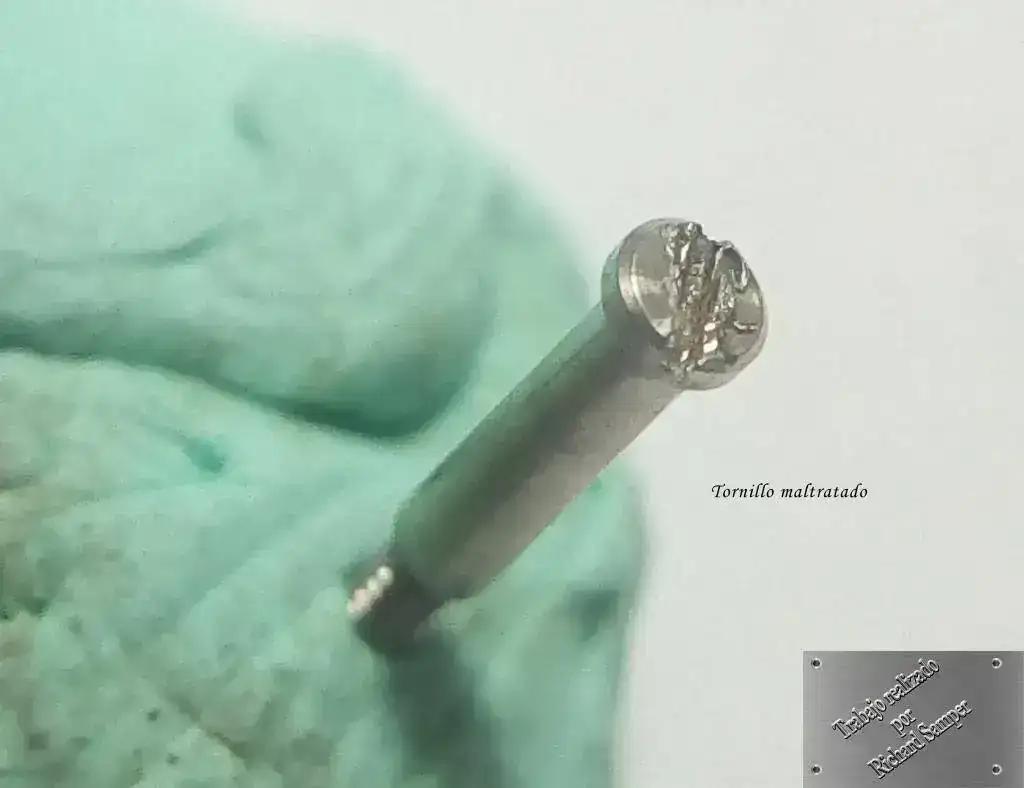 Tened en cuenta que es mejor que no uséis un mandril para sujetar el tornillo, para que no maltratéis la rosca; lo mejor es que uséis una pinza de relojería que sea de punta gruesa y que apliquéis la presión de las puntas de la pinza en la sección lisa del tornillo, nunca en la rosca. Paso seguido a esta interpelación; continuamos con el tema.
