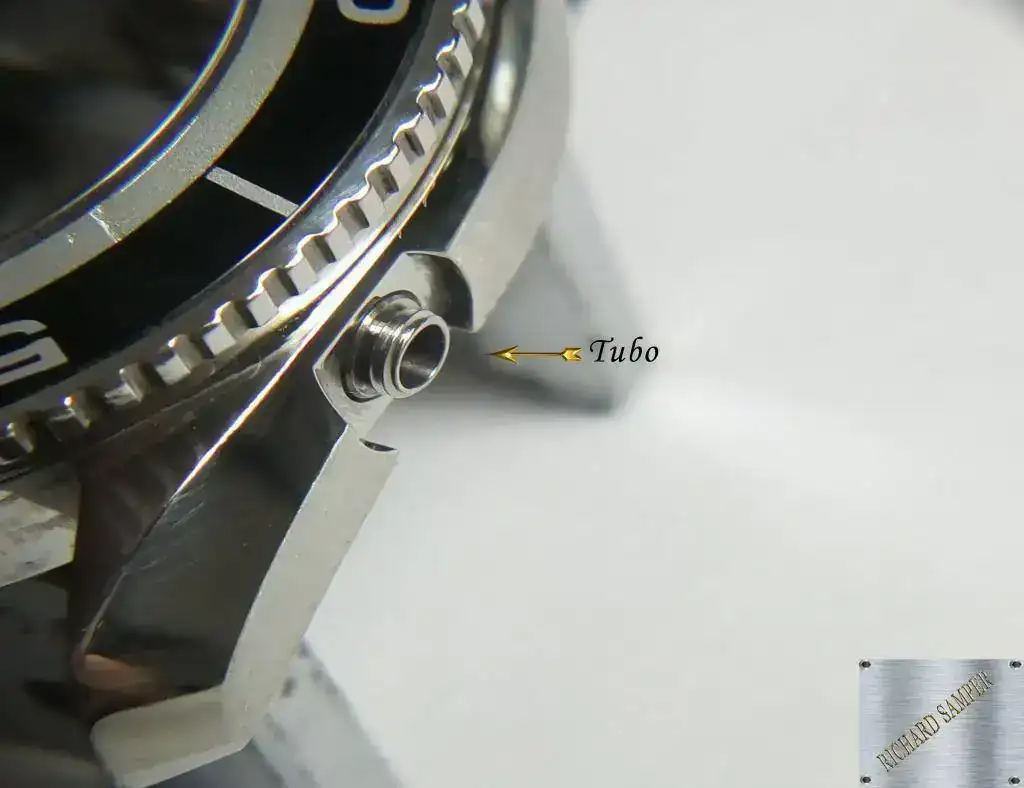 He tomado para vosotros una foto de la caja de este reloj, desde una perspectiva transversal; en dicha imagen podéis apreciar el tubo de la válvula manual de helio; notad que no es simplemente un tubo con rosca; si no que, además de algunas otras particularidades de diseño, el fondo de este tubo tiene una estructura de tope. Es como un fondo cuyo centro es horadado. Este es el plano de limitación o tope interno del tubo.