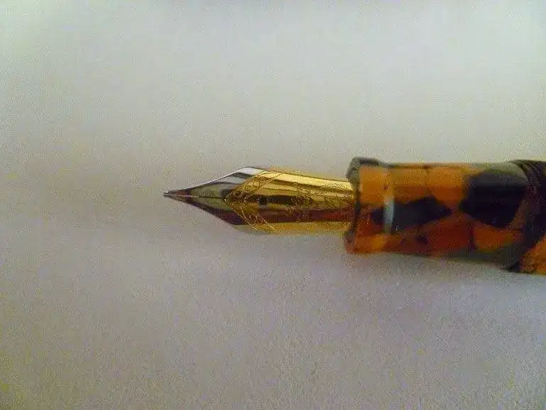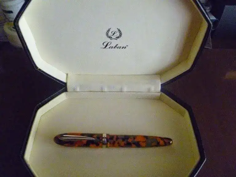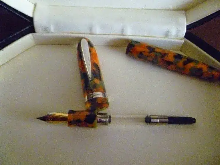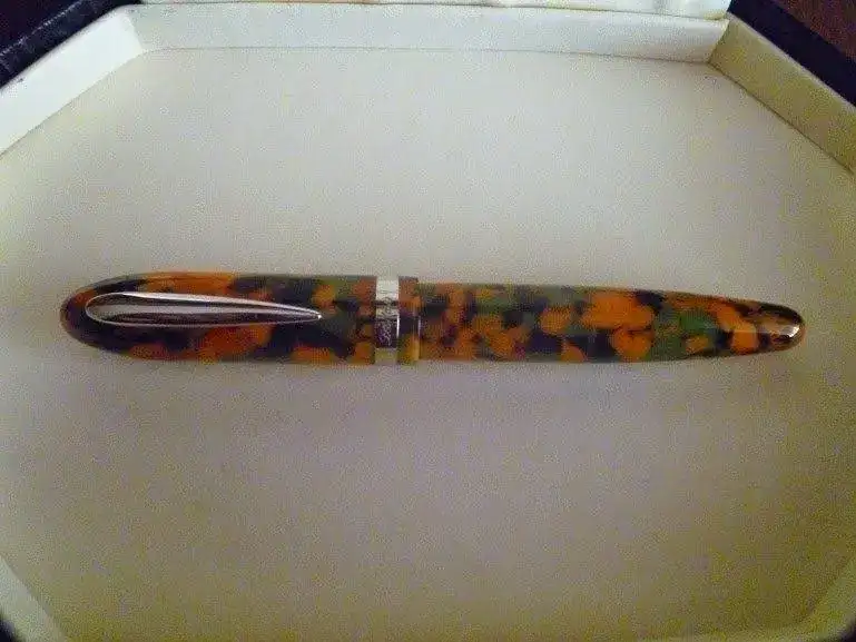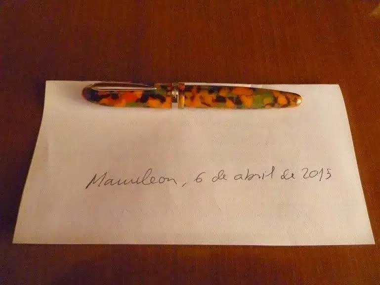 Se trata una pluma de gran tamaño, y cada vez soy menos "desmesurado". En resina con ornatos de plata rodiada, sigue el estándar de calidad de la marca, terminaciones y materiales de primera. Plumín bitono chapado "M". Incluye convertidor. Está en perfecto estado, como nueva, pues se ha utilizado muy poco.