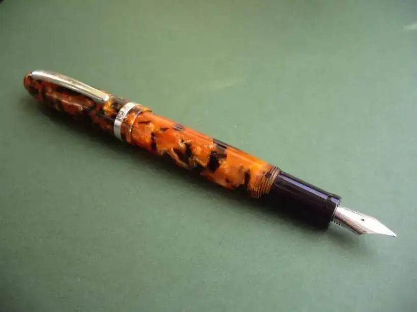 Laban es una marca de artículos de escritura de Taiwan, que realiza unos productos, a tenor de esta estilográfica, más que dignos. Sinceramente la resina o plástico ambar de esta estilográfica, combinada con el moteado negro está, a mi juicio, muy lograda y resulta muy vistosa y aparente.