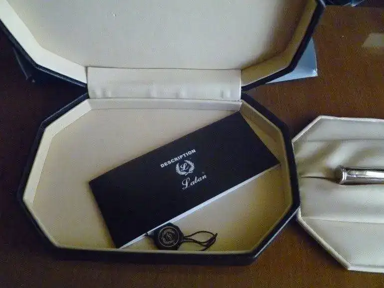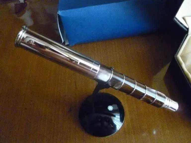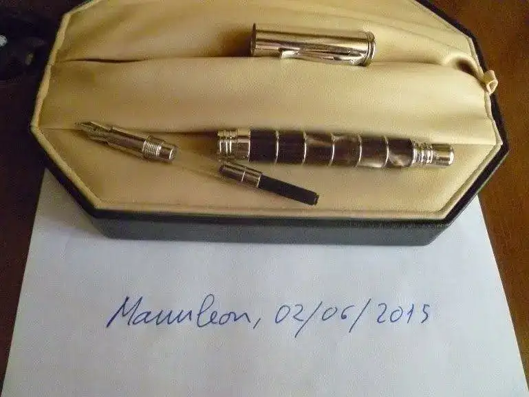 Estilográfica contundente por tamaño y peso, el cuerpo está realizado intercalando sobre un tubo de soporte anillos de resina muuuyyy bella con intensas variaciones de color, con anillos de plata rodiada. El plumín, como he puesto arriba, es de oro rodiado de 18 Kt. El punto es un "M" muy muy muy jugoso. A mí me parece una brocha. Tiene el tamaño aproximado de una Pelikan M 1000. Viene con toda la parafernalia propia de la marca: guardapolvo muy bonito, caja espectacular, convertidor original...