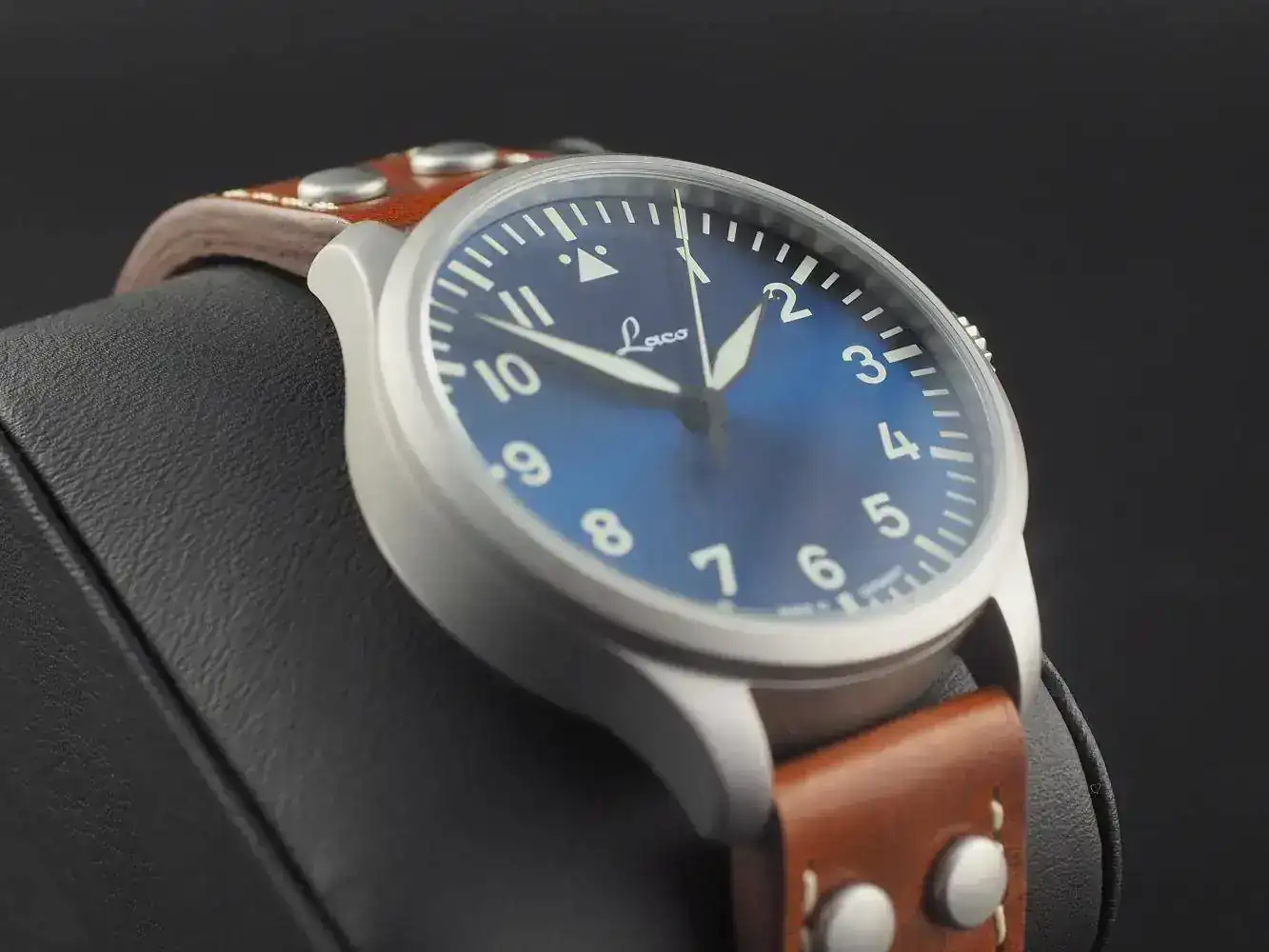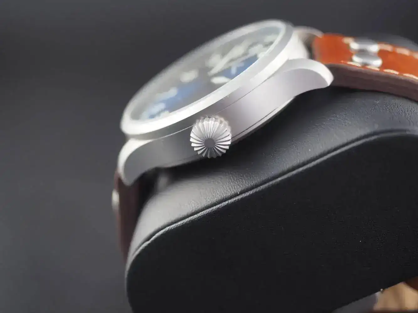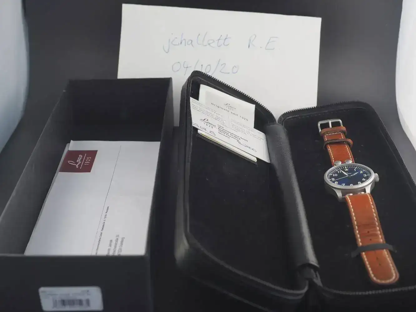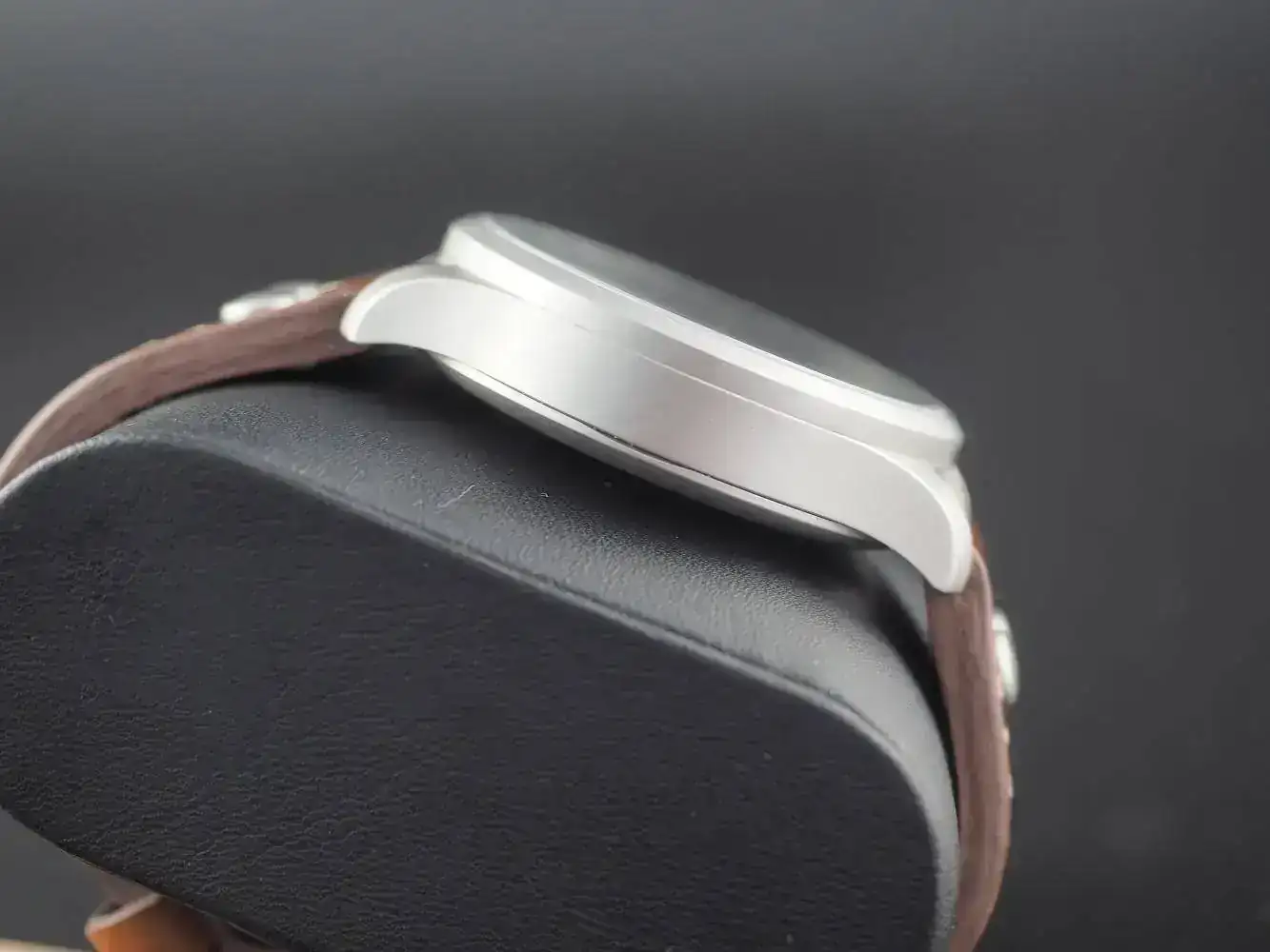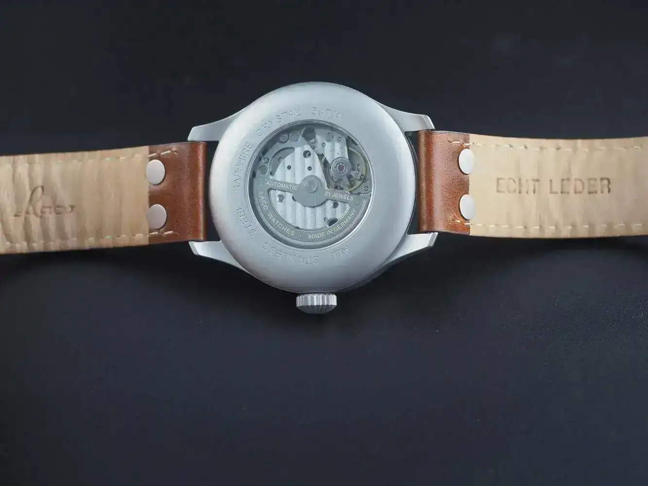 Normalmente este reloj viene con una nato gris, pero el comprador original pidió el cambio para la correa de cuero típica de los flieger de esta marca. Me parece que le queda muy bien. La correa ha tenido su uso, pero casi es una ventaja, porque ya está más blanda y se adapta mejor a la muñeca.