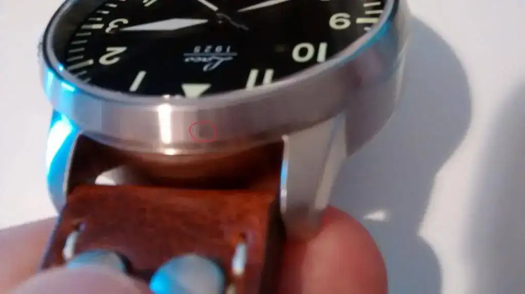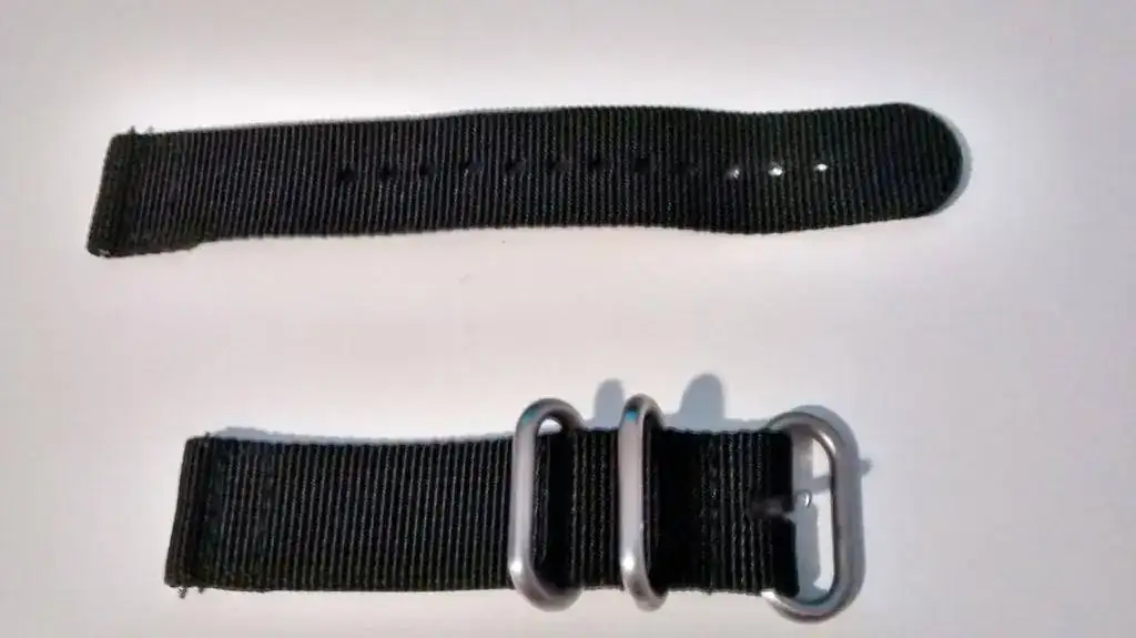 , incluyo una correa textil de dos piezas en nylon de color negro que le queda de lujo, como veréis en las fotos. Hay una manchita ínfima en el borde cerca de las 12, lo marco en rojo, que casi ni pude sacar visible. Va con documentación y la pedazo de caja marca de la casa.