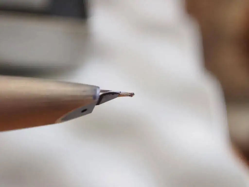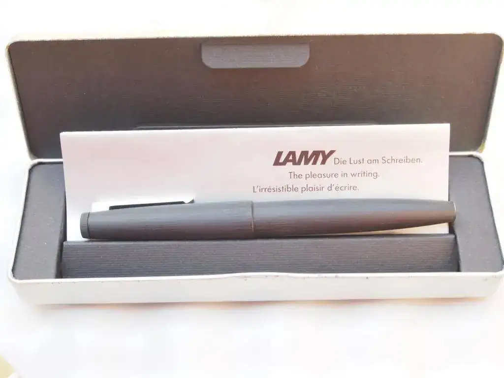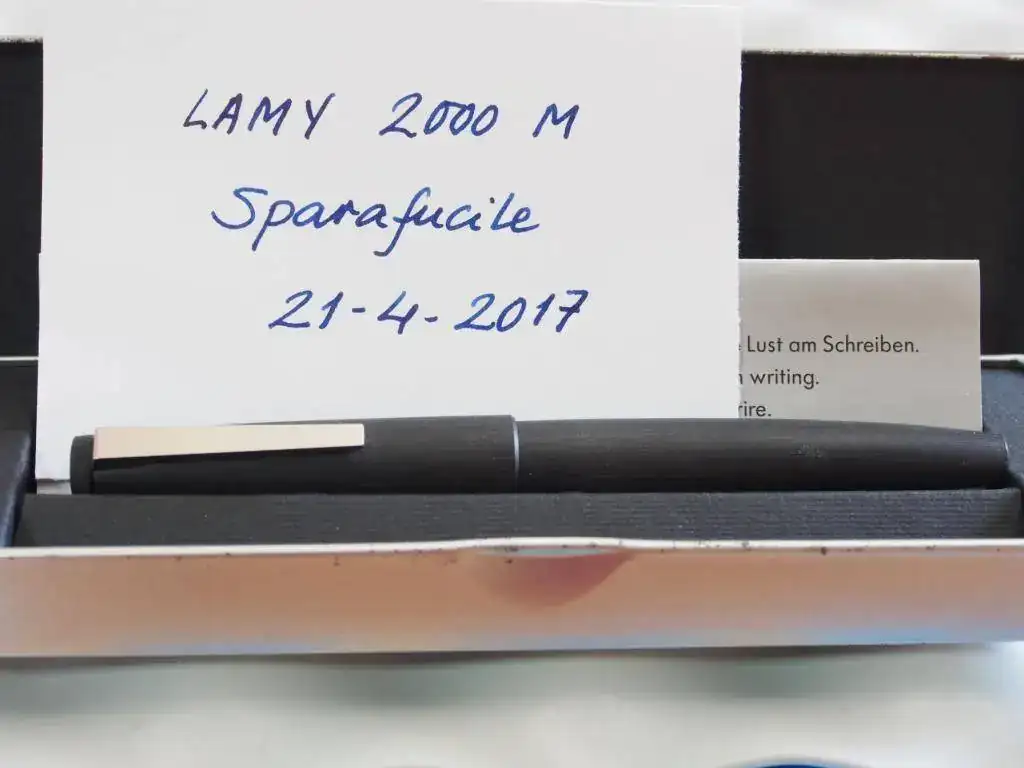 Saco a la venta esta Lamy 2000 de plumín M suave y muy jugoso. Muy poco usada (solamente una carga), diríamos que casi nueva. La prueba de escritura de la tarjeta está realizada con la propia estilográfica. Va en su caja metálica original, un poquito oxidada por los bordes.