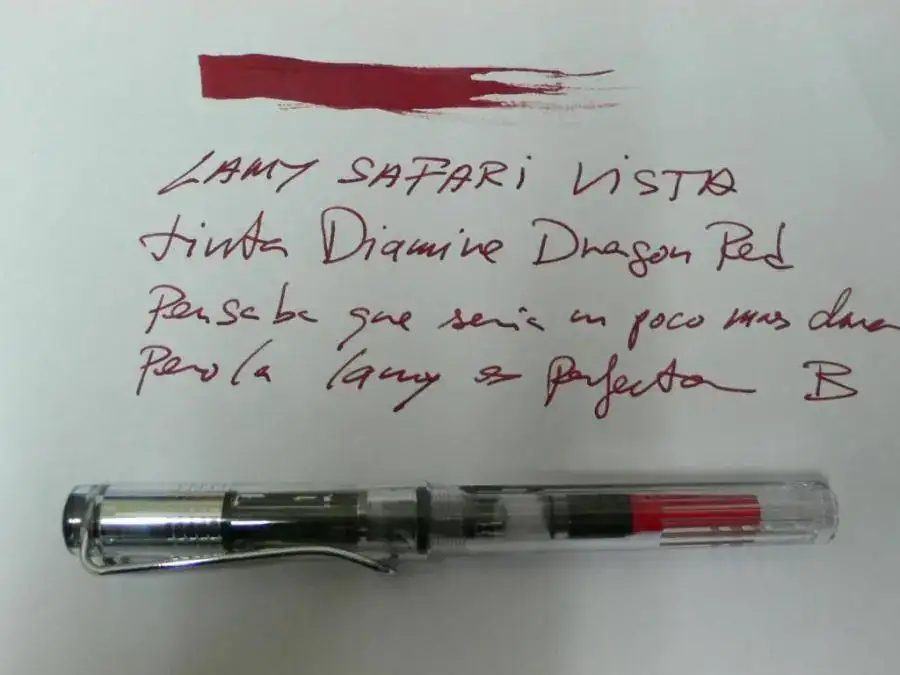 Hola a todos, he comprado por la bahia esta lamy y una diamine dragón red. La Lamy por lo que vale está pero que muy bien, es punto B. La tinta pensaba que sería un poco mas clara pero al escribir parece casi granate. Un saludo