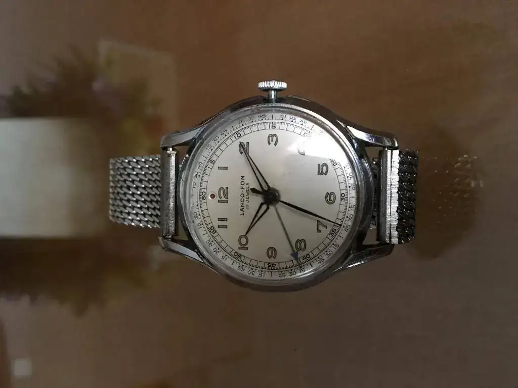 Ha llegado a mis manos un LANCO-FON y me gustaría, si no os importa, que me echarais una mano. El caso es que el reloj, aún a pesar de los años que tiene está en muy buen estado, como podréis observar en la foto que adjunto. Este modelo dispone de sonería, pero desgraciadamente no funciona, así es que decidí llevarlo a mi relojero de confianza para que me dijera que podría sucederle. Lo que le sucede es que el mecanismo está tan sumamente gastado que es imposible que funcione, a no ser que se le cambiara. Aquí es donde necesito vuestra ayuda y vuestro consejo y que me digáis si merece la pena invertir en arreglarlo. No hay repuestos y para que volviera a funcionar habría que mecanizar el mecanismo completo de la sonería (sería carísimo y en mi opinión no compensaría hacerlo), o bien intentar buscar uno en Internet para recuperar las piezas y ponerlas en este.