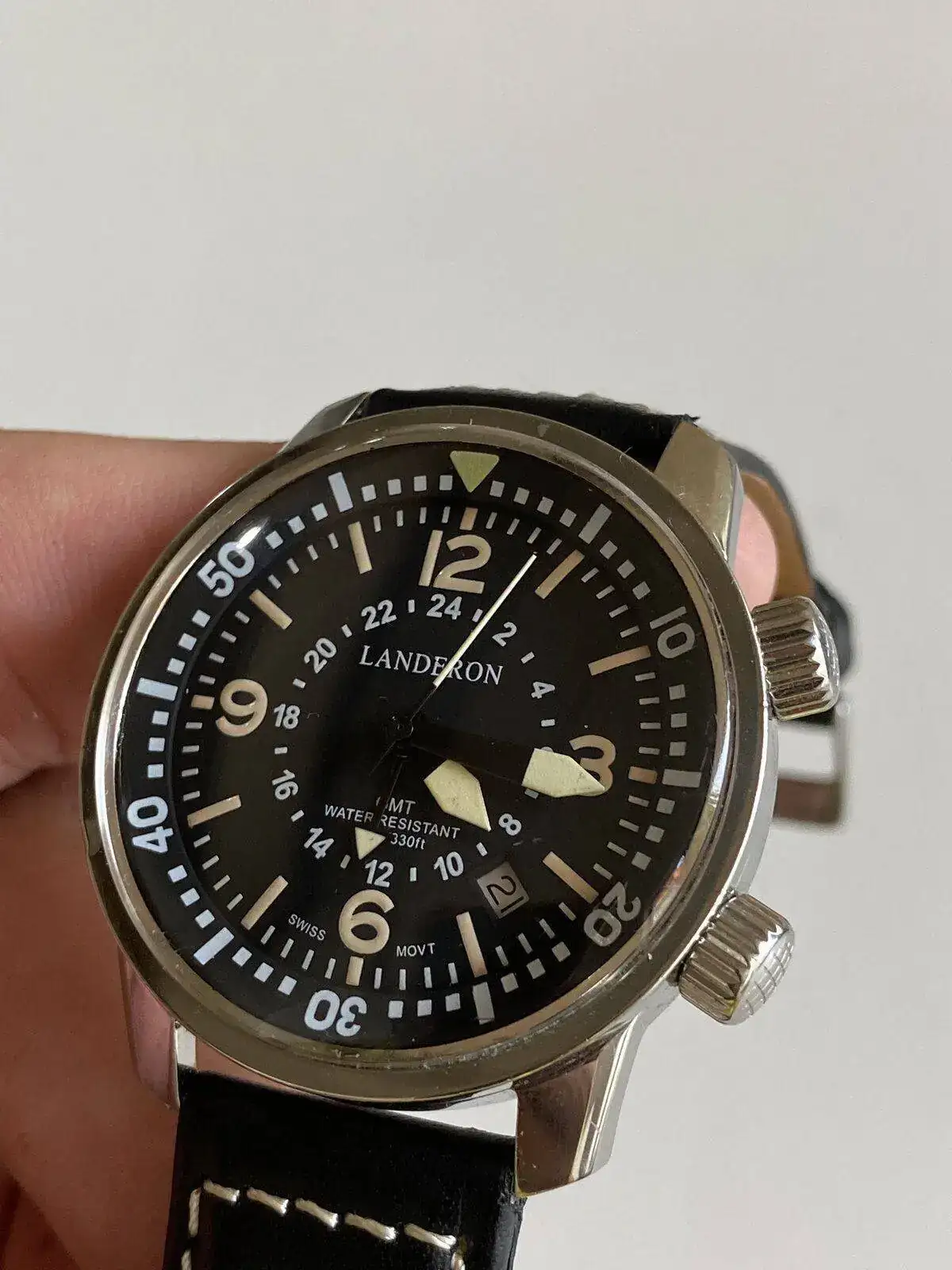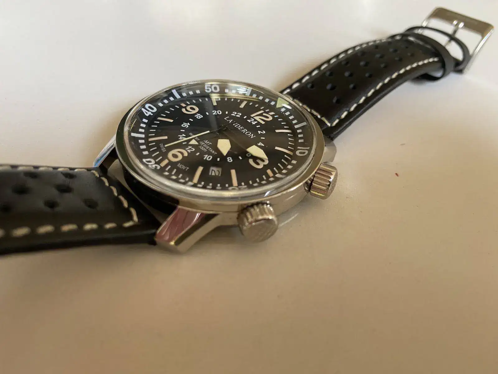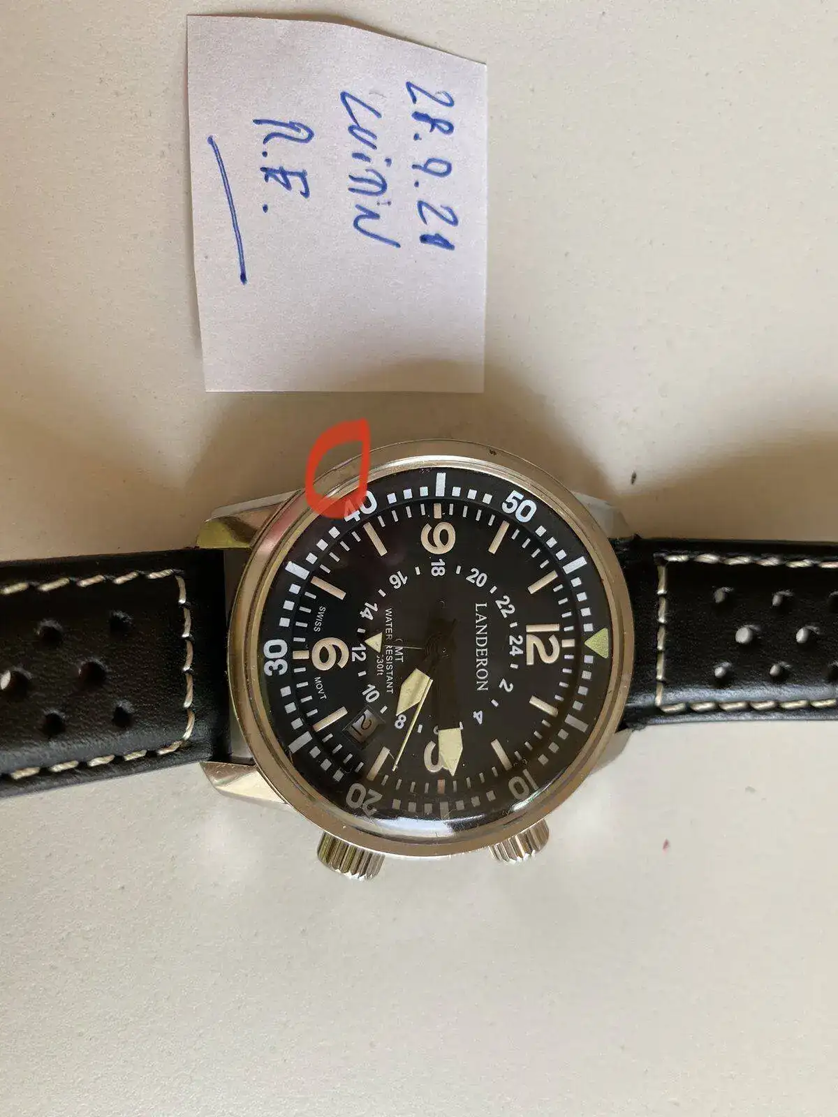 Saco a venta sin cambio este Landeron Compressor GMT precioso, poquísimo uso como se ve en el reloj y correa casi sin uso; solo destacar una pequeñísima marquita que apenas se ve en un lateral (circulo rojo en foto ampliada) os dejo características de la web, donde su pvp es de 350 mas envio. Lo dejo en 180 euros para salida rapida