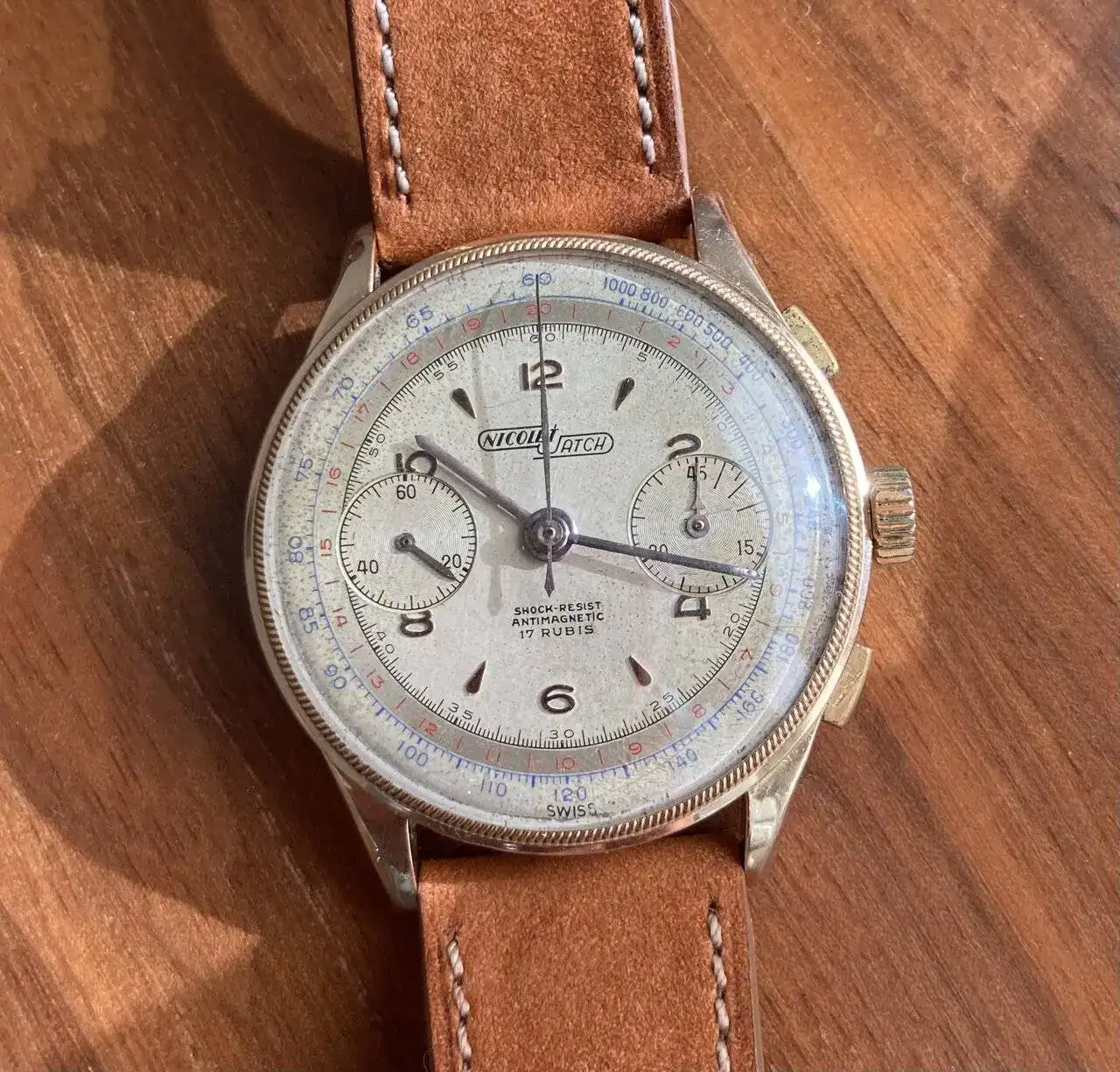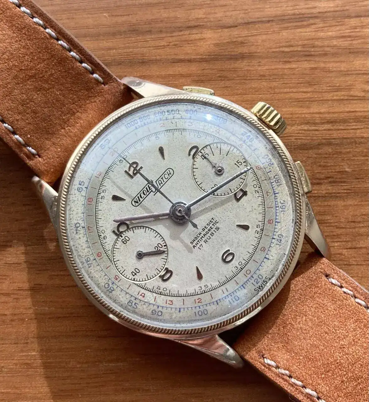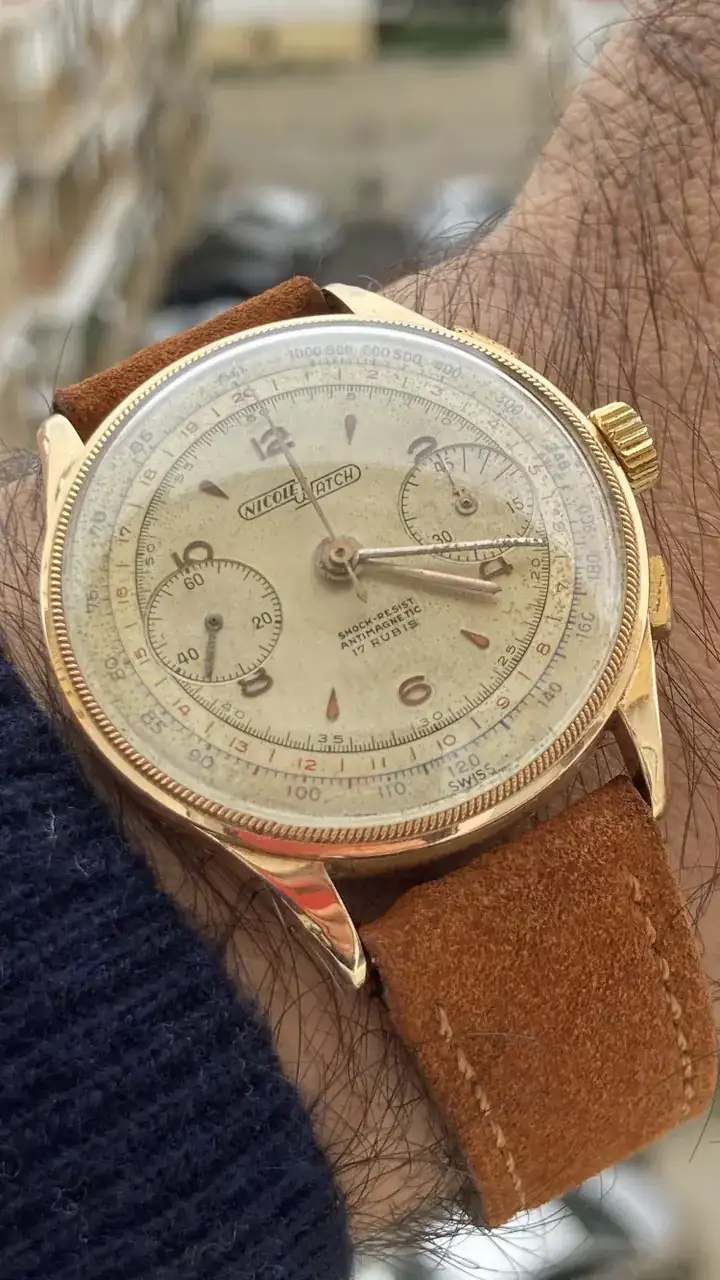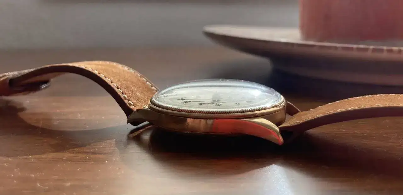 El protagonista de este hilo, presenta una caja de oro sólido de 18k, y aunque las condiciones de las asas no son las mejores en cuanto a golpes se refiere, la forma dentada del bisel y la pátina del dial, hicieron que esto pasara a un segundo plano.