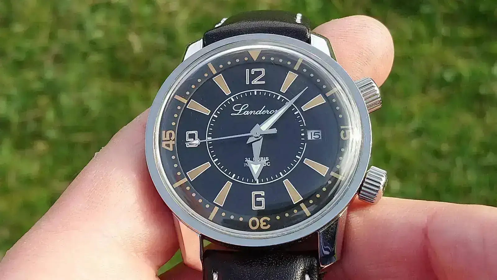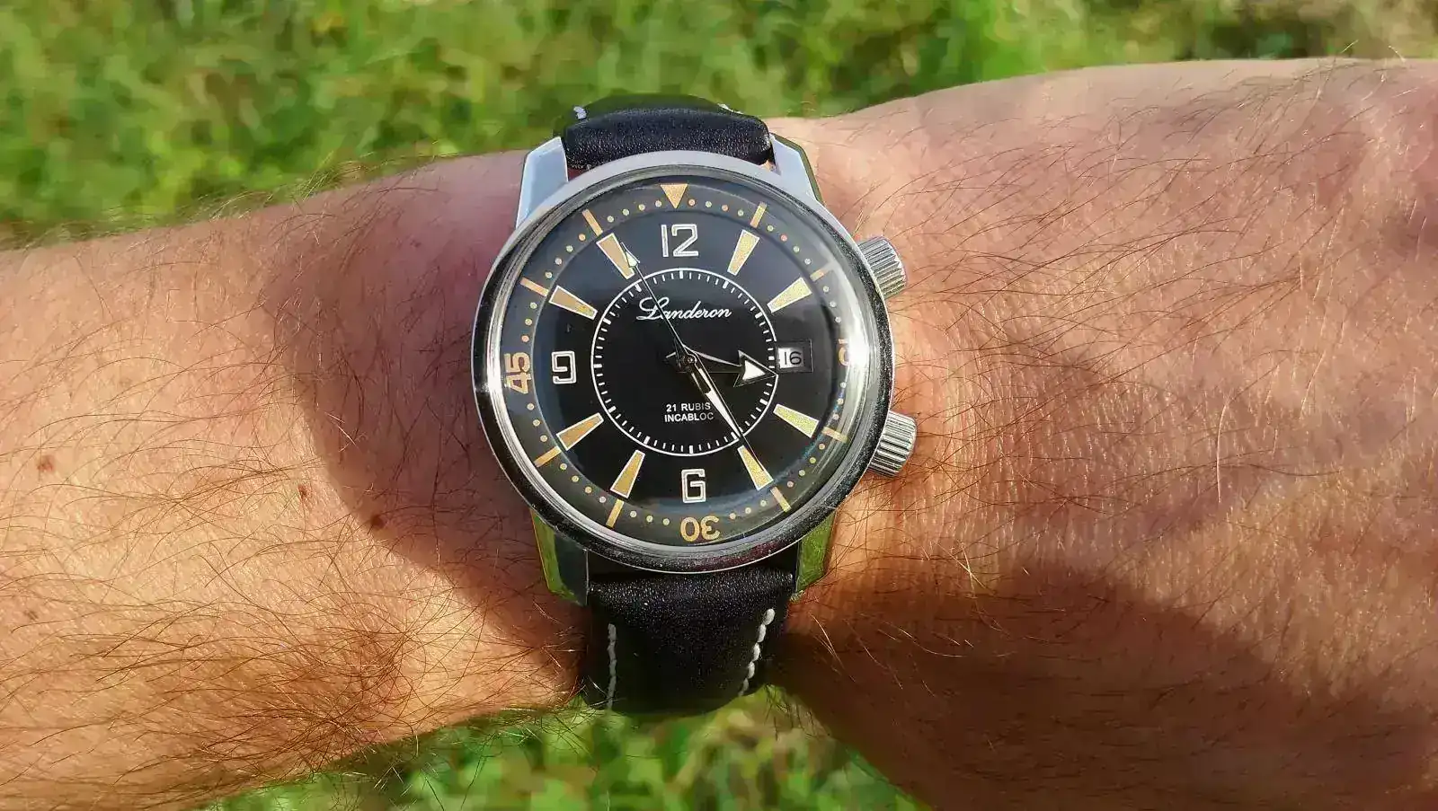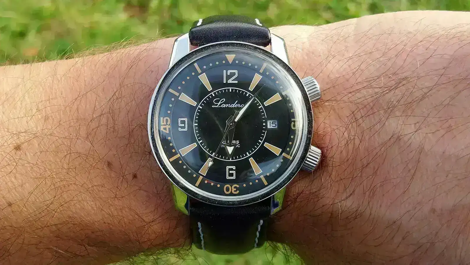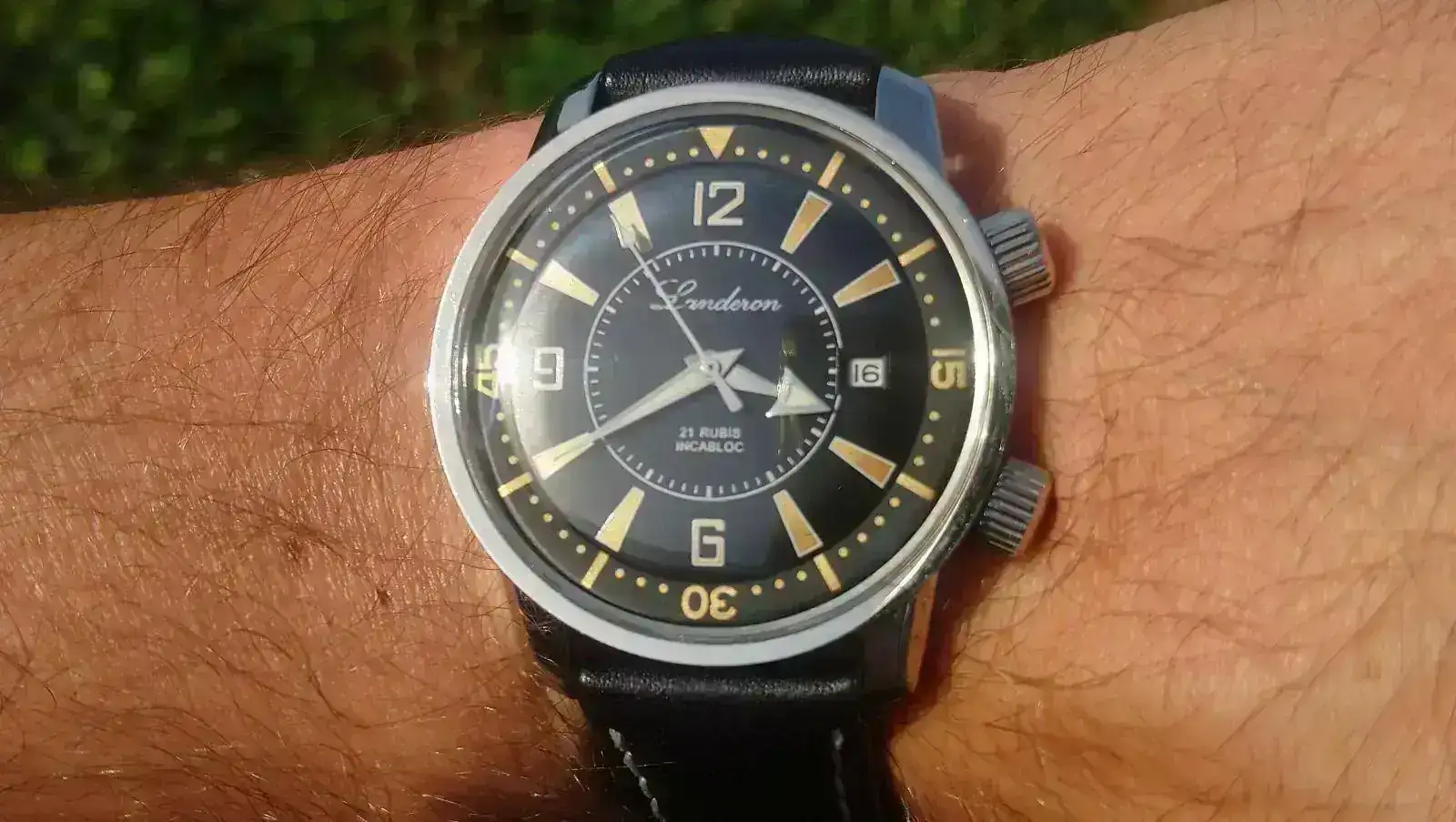 En muy buen estado, homenaje al JLC Polaris, con una estetica muy retro, plexi, doble corona, agujas Plongeur.