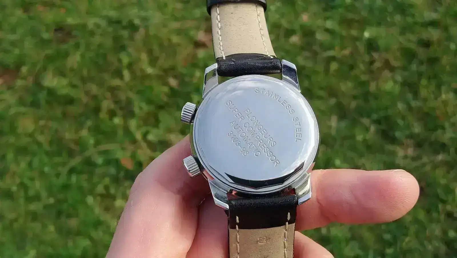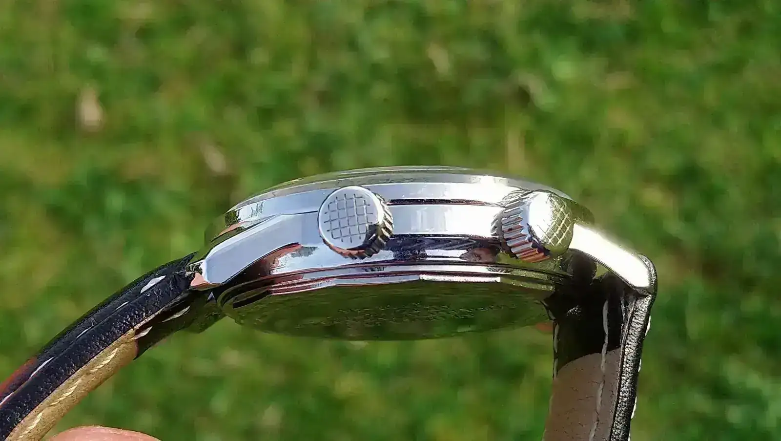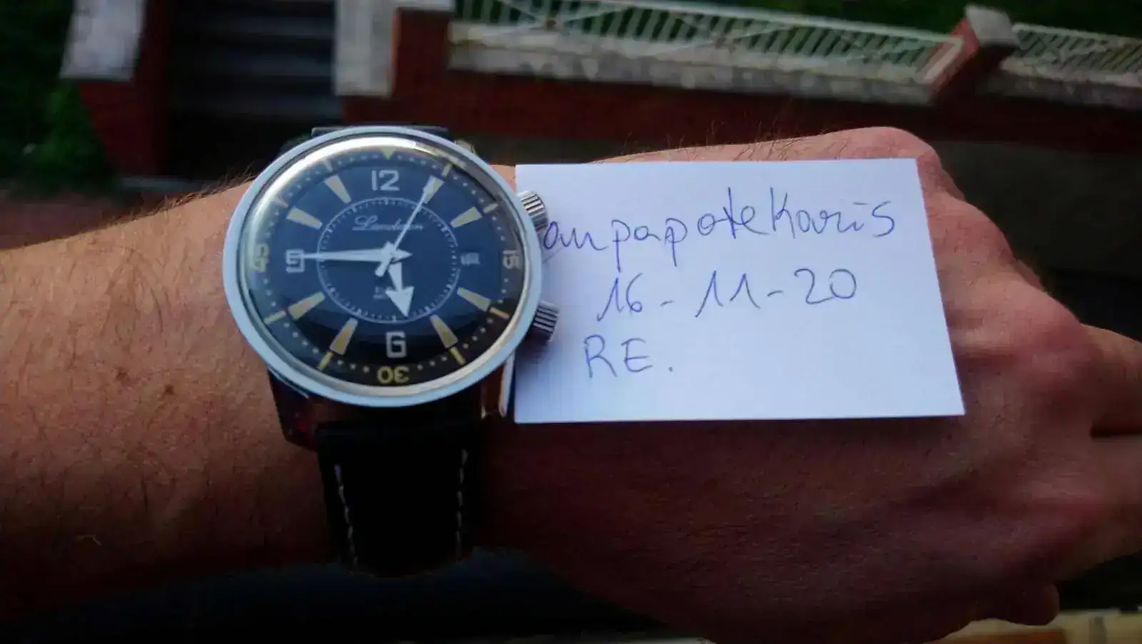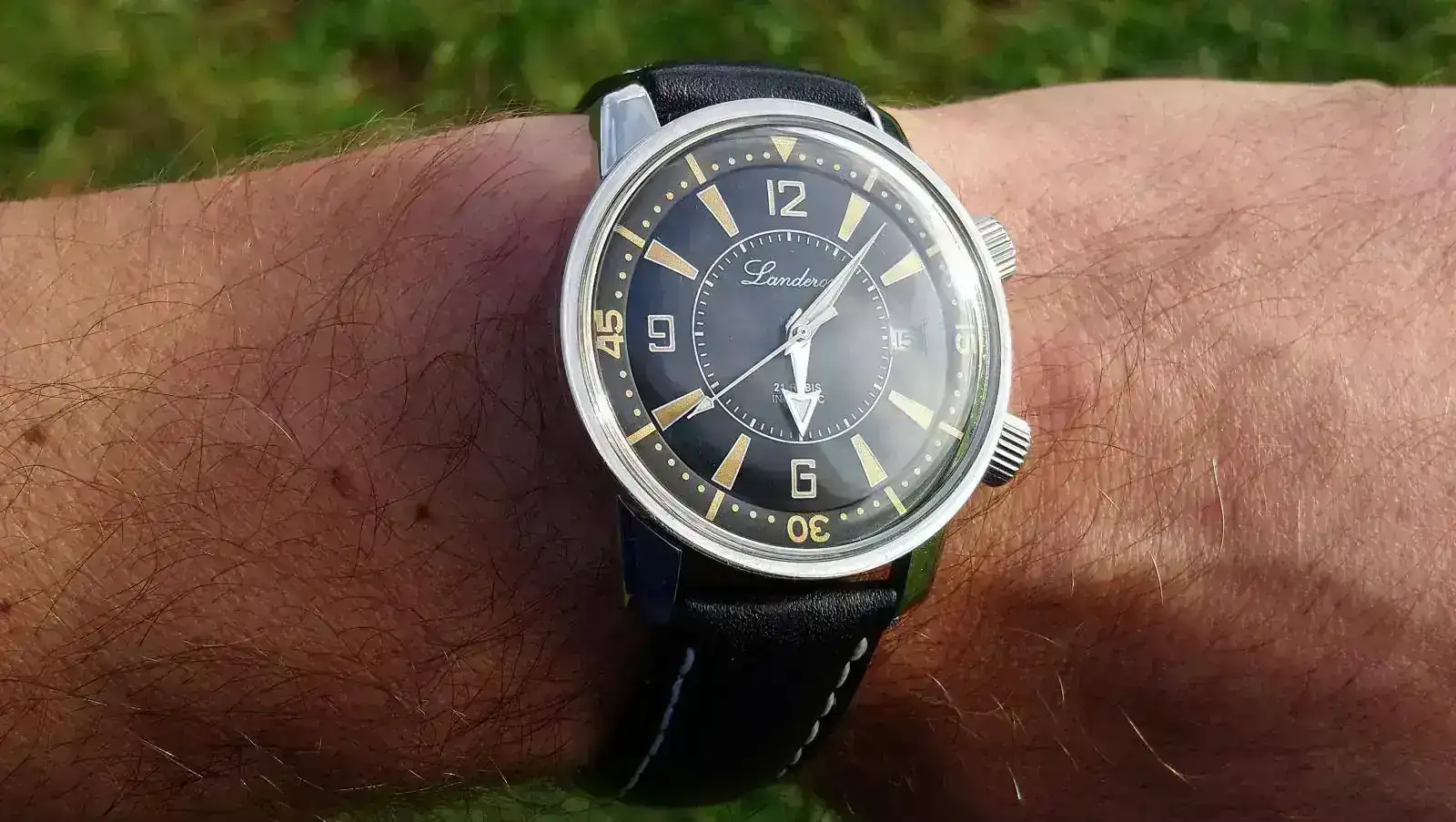 En muy buen estado, homenaje al JLC Polaris, con una estetica muy retro, plexi, doble corona, agujas Plongeur.