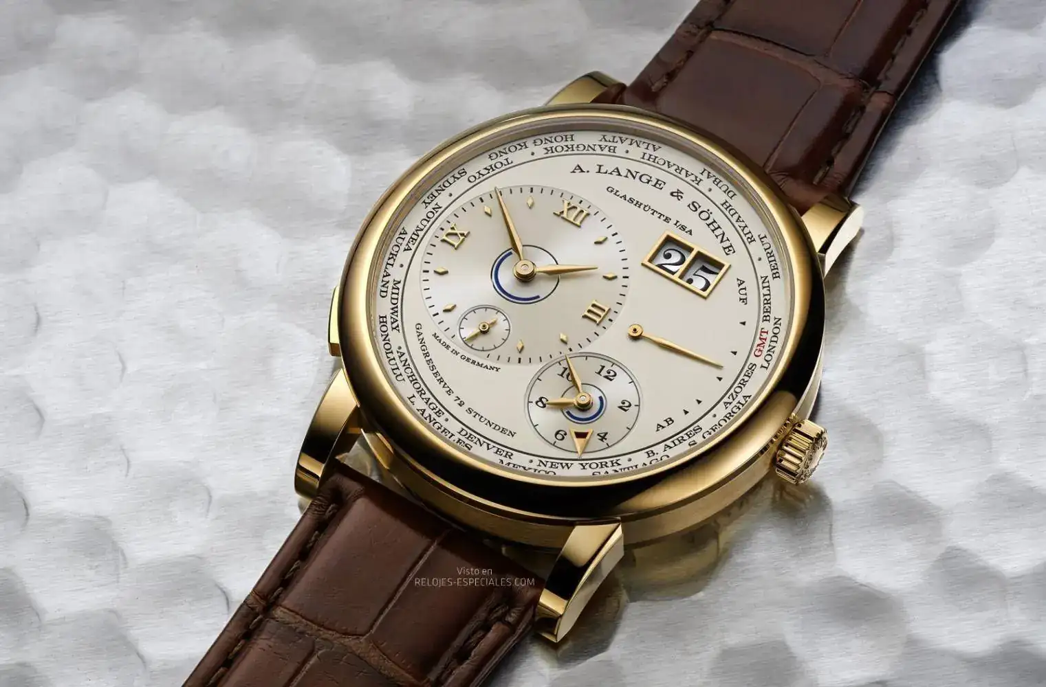 Ya en 2005 A. Lange & Söhne había diseñado para los viajeros un reloj con dos husos horarios basado en el LANGE 1, con el que se puede consultar cómodamente la hora de 24 husos horarios. 15 años después el Lange 1 Husos Horarios recibe un nuevo calibre de la manufactura. Las indicaciones día/noche en forma de anillo facilitan la consulta y la indicación de la hora de verano ofrece una orientación adicional.