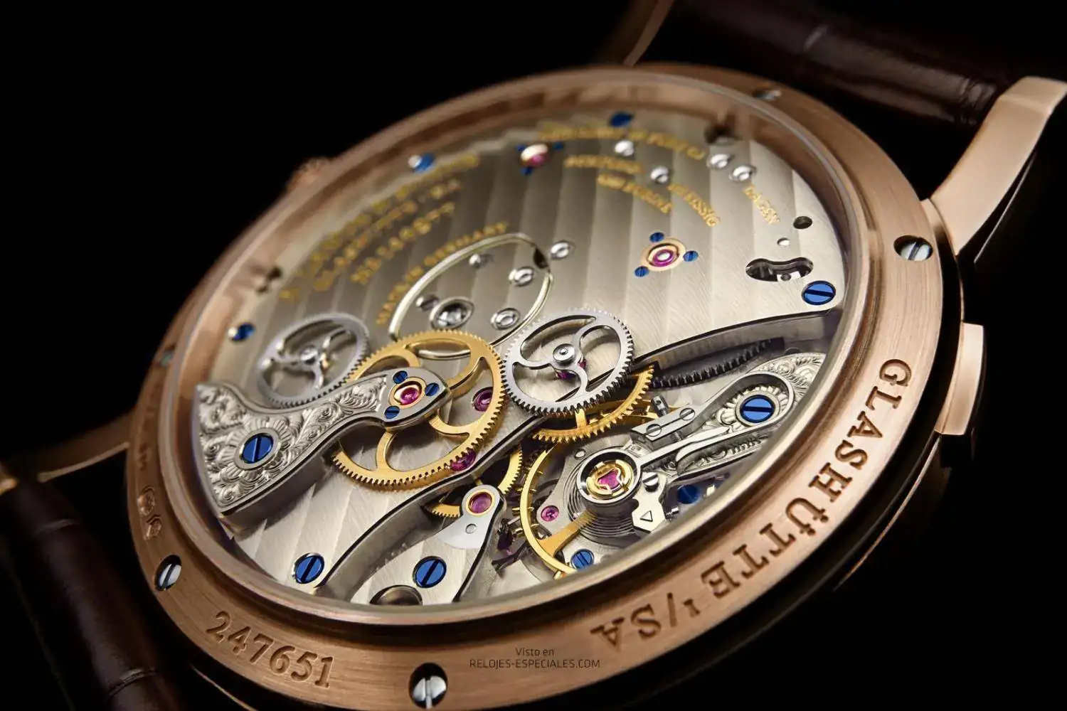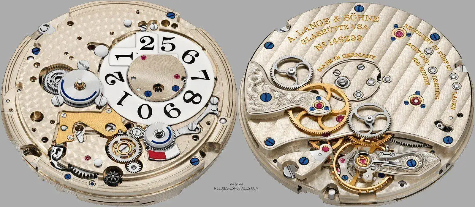 Calibre de la manufactura Lange L141.1, cuerda manual, fabricado según los máximos criterios de calidad de Lange, decorado y montado a mano; regulado con precisión en cinco posiciones; platinas y puentes de alpaca natural; volante y puente de la rueda intermedia grabados a mano