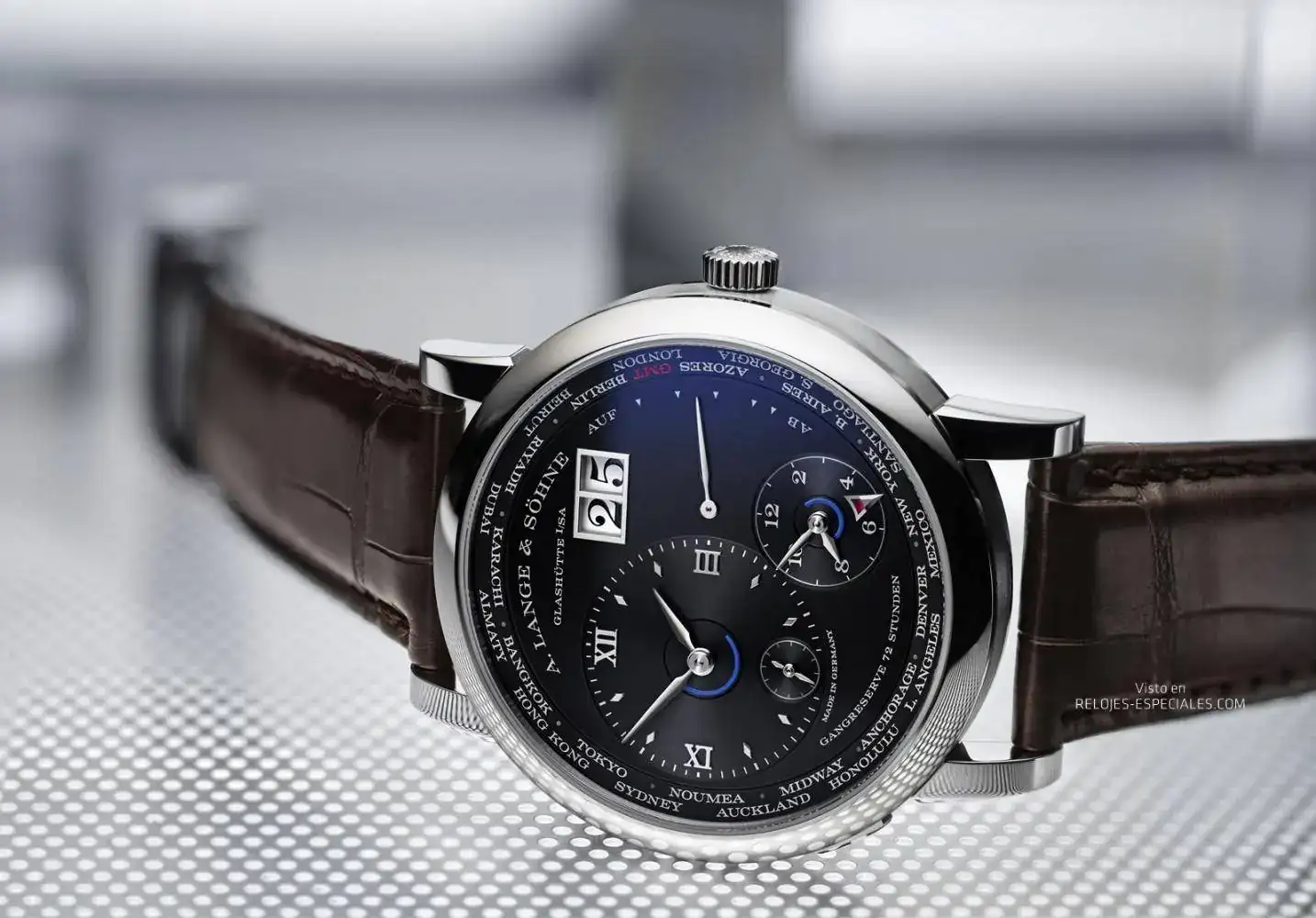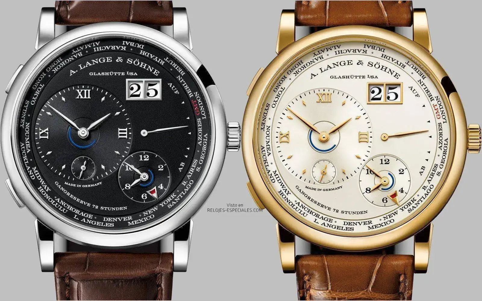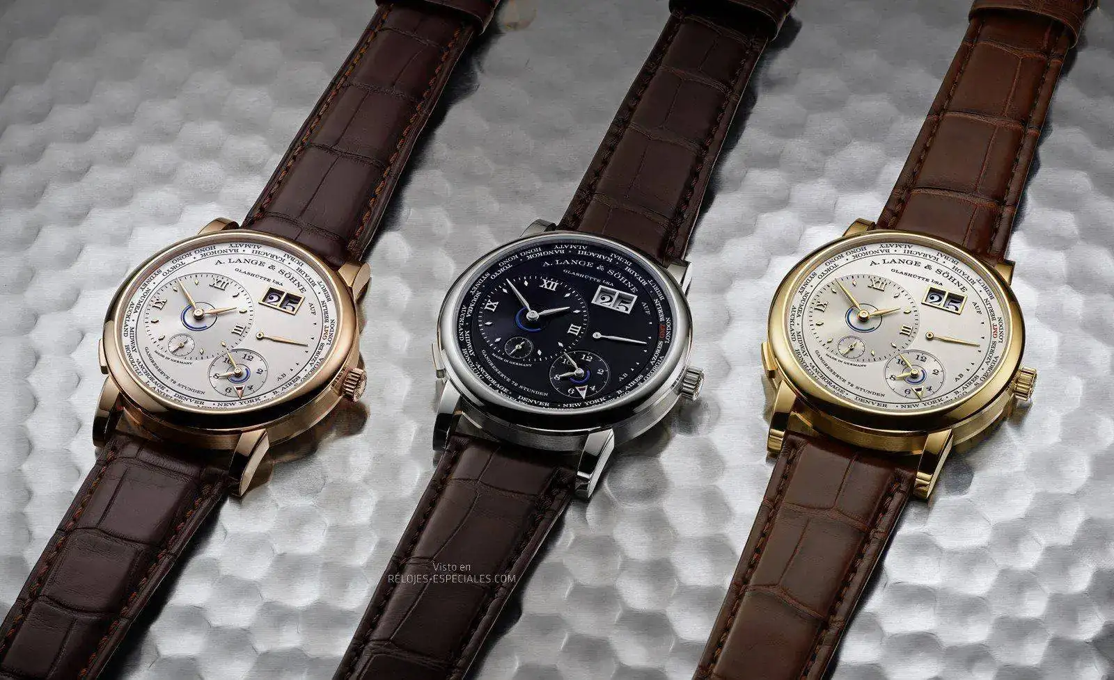 El nuevo Lange 1 Husos Horarios está disponible en las siguientes combinaciones de caja y esfera: oro blanco y negro, oro rosa y plateado, y una edición limitada a 100 ejemplares de oro amarillo y champán.