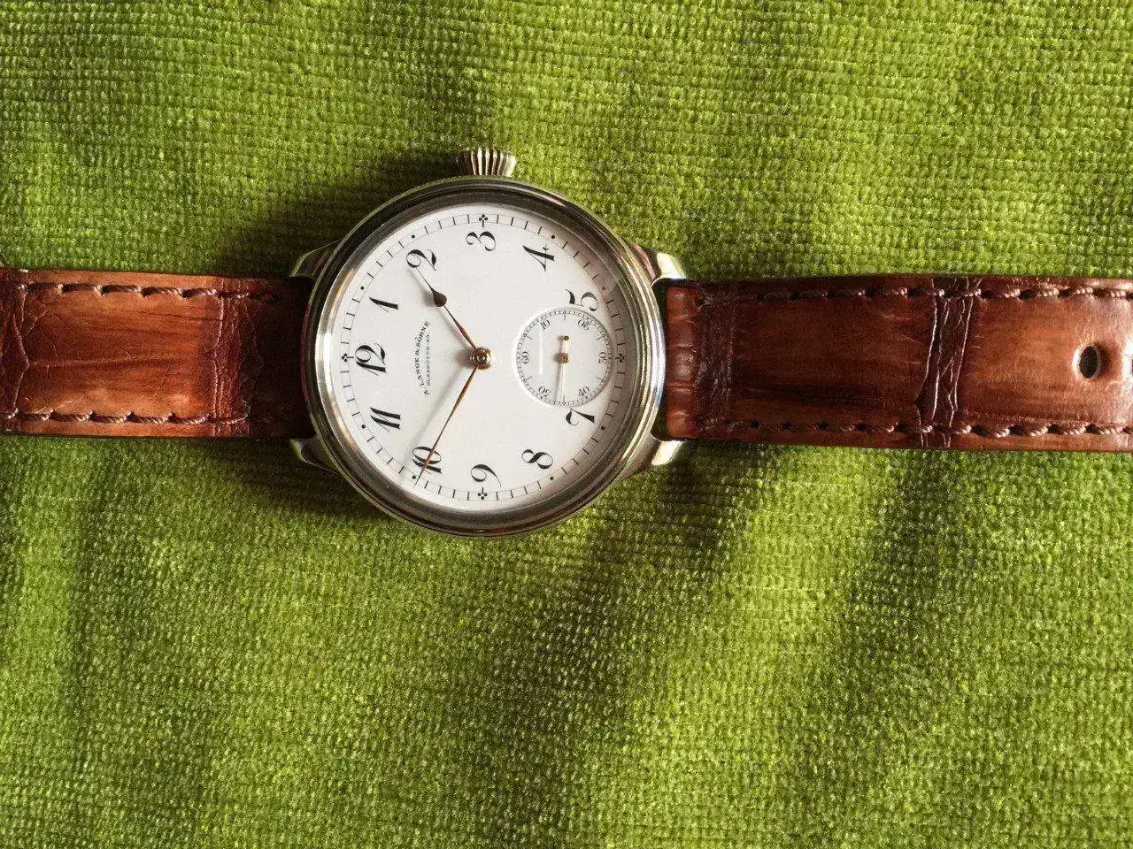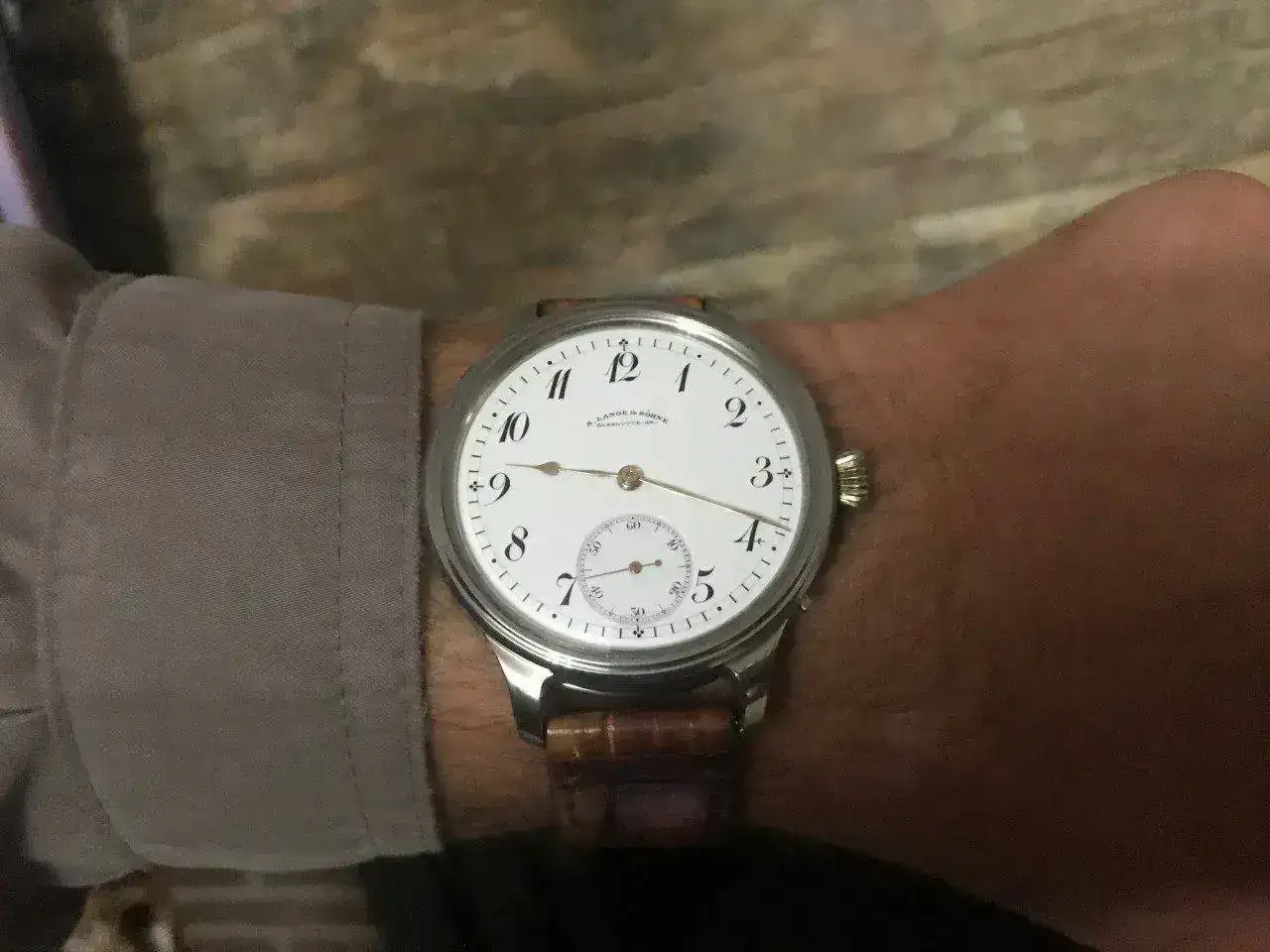 Nació como reloj de bolsillo, pero ya se fundió su caja de oro (nada nuevo para los tiempos que vivimos) y ahora para una segunda vida volvió como un “mariage”, para disfrutarlo en la muñeca, reloj de la marca “Lange Söhne” fabricado en Dresden, por su numeración es de 1911, anterior a los cambios de la posguerra en 1918 a los relojes DUF de la Uhrenfabrik Gkashutte en Sachsen.