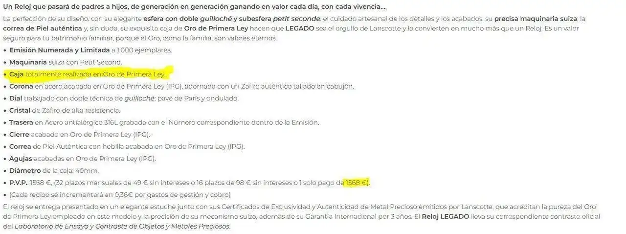 Al final, ni siquiera sirve como inversión en metal. La cantidad de oro por reloj es de sólo 5.5 gramos. Y los veo a la venta en mil y pico euros, un reloj en el que creo que lo que más valor puede tener es el estuche de presentación.