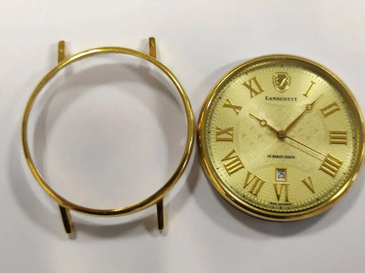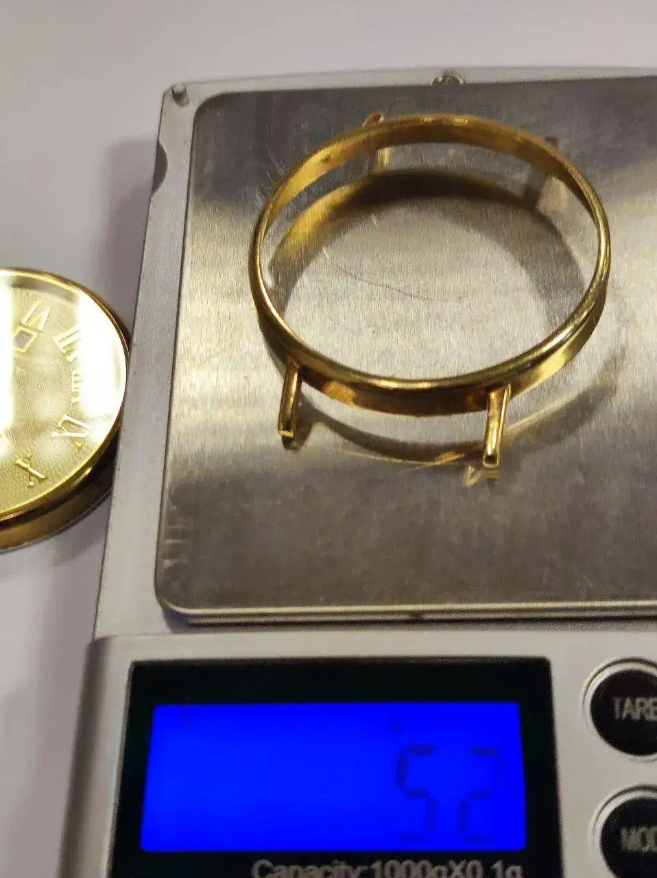 Pero, leches... al poco tiempo, como la correa está bastante desgastada, tiro mano para cambiarla. Y al hacer presión para separar los pasadores de unión de la correa a la caja, noto cierta flexión en la pata... extrañado, abro el reloj. Y me encuentro con una finísima fisura en mitad de la pared de la caja. Mosqueado, me centro en eso... y me encuentro CON UNA BATA QUE FALSEA EL ASPECTO DE LA CAJA. Una puñetera bata de metal sin indicación alguna... ni color diferentne, ni la palabra METAL, ni la palabra NO GOLD, ni siquiera GOLD PLATED, ni ninguna forma honrada de avisar de que eso no es oro. Al contrario... disimulado hasta el punto de que se engañó al que me lo vendió, con una amplia experiencia y de confianza, que me engañó a mí (soy fácilmente engañado), y que engañó a este chaval. Y el caso es que este último me decía... "Oye, que los relojes de oro suelen tener la tapa trasera también de oro"... y yo le respondía que como la tapa es tan grande (puede que tenga unos 45 mm), pues que el espesor debería ser suficiente para que no flexionase, que igual estaríamos hablando de 1 mm de espesor de oro, y que eso encarecería mucho el precio porque esa tapa trasera podría pesar perfectamente 10 ó 15 gramos.