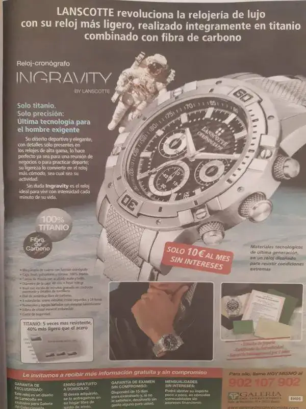 Lo del anuncio tiene traca. Meter al astronauta evoca los anuncios del Speedy. Supongo que por sí se le pega algo. Y la foto inferior, con el hombre agarrándose la barbilla pensando si el reloj vale lo que cuesta. Aunque de los anuncios de TV también se podría hablar, con presentadores haciendo la pelota al reloj de turno