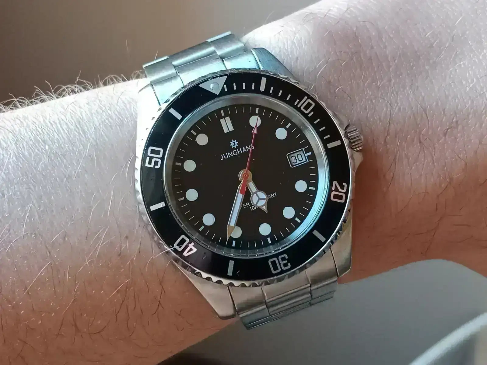Tal como se espera de Junghans, el armis de acero cuenta con todas las características de una buen brazalete: extensión para portarlo sobre el traje de buceo ( o el jersey o la manga de la chaqueta del traje ... para los que lo usaremos en la oficina