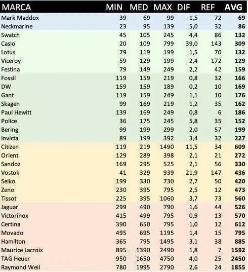 PD: acompaño una tabla comparativa a partir de algunas marcas comercializadas en ECI, donde figuran el precio más bajo, el más alto, el mediano (el de un reloj que ocupa el lugar medio en la distribución del total de referencias de dicha marca), el medio (suma de esos tres), el porcentaje de incremento entre el inferior y el superior, y el número de referencias de cada marca en su web, además de separar “subgamas” por colores. Para que veáis lo “zumbao” que me he vuelto con esto, jajaja.