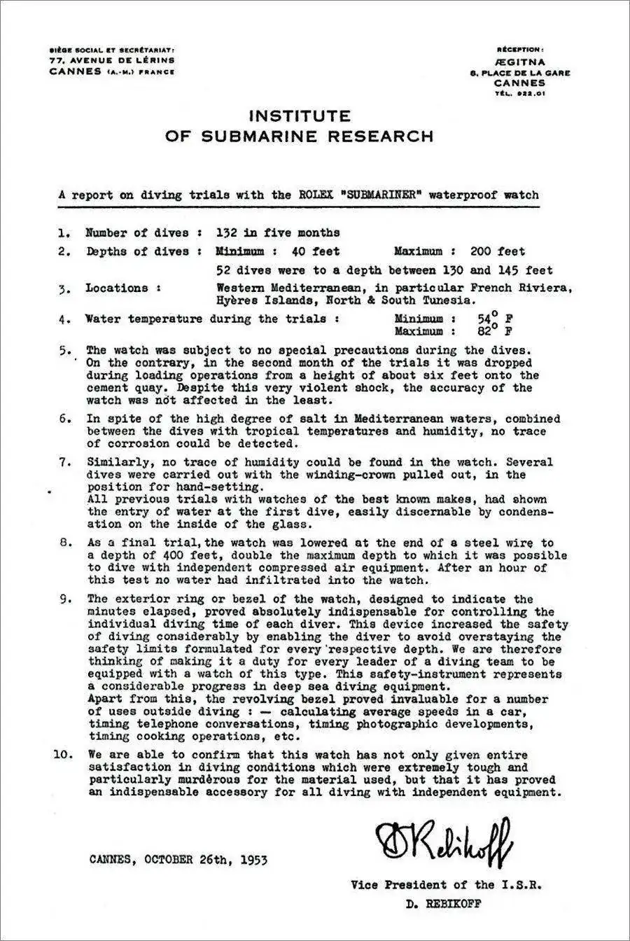 El mismo año hizo por fin su aparición el modelo de Rolex diseñado para la actividad subacuática, el Submariner. Todavía no tenía el bisel unidireccional que ahora es el estándar de los relojes de buzo, ya que no estuvo disponible hasta los años 80 en que expiró la patente de Blancpain. El Fifty Fathoms de Blancpain, su competidor, no tenía una corona roscada, al ser esta una patente de Rolex. Los aficionados a los relojes tuvimos que esperar a que expiraran las patentes de todos para disfrutar de un reloj de submarinismo ideal.