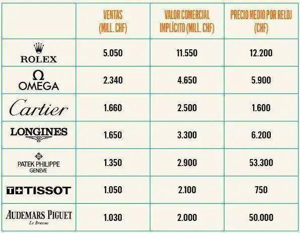 Según un reportaje de Forbes en internet, del cual pongo su acceso, las siete marcas relojeras que más venden en el mundo son: Rolex, Omega, Cartier, Longines, Patek Philippe, Tissot y Audemars Piguet.