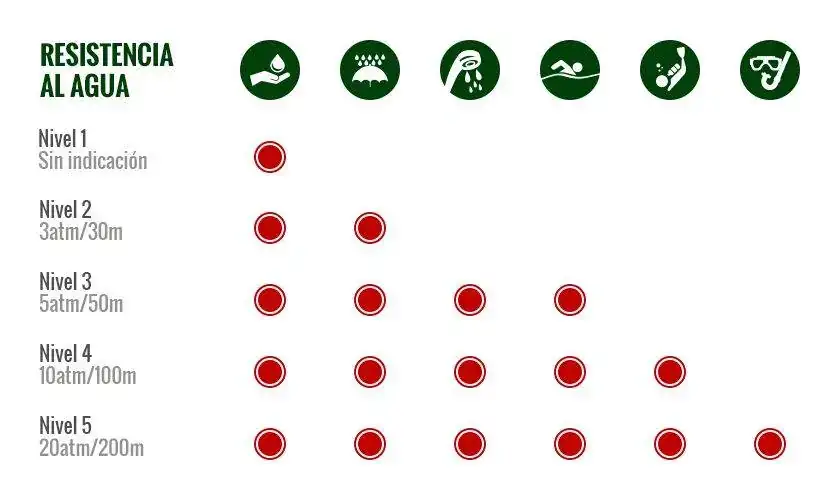 3 atm/bar. 30m. Lluvia, sudor y salpicaduras.