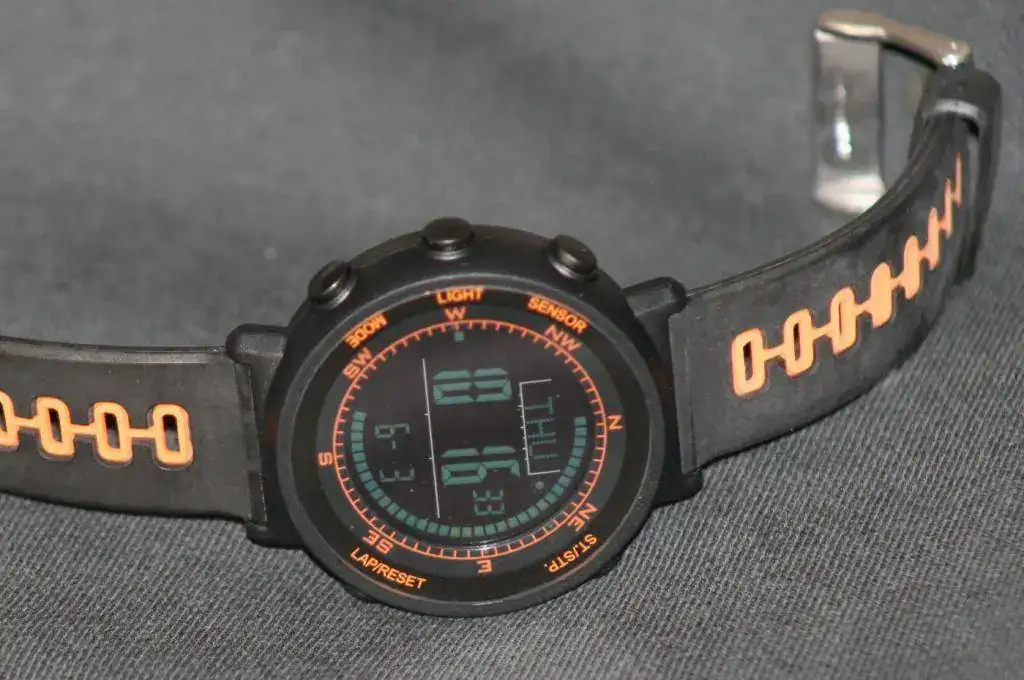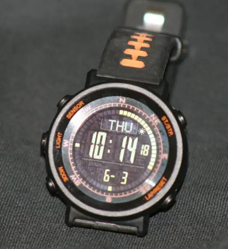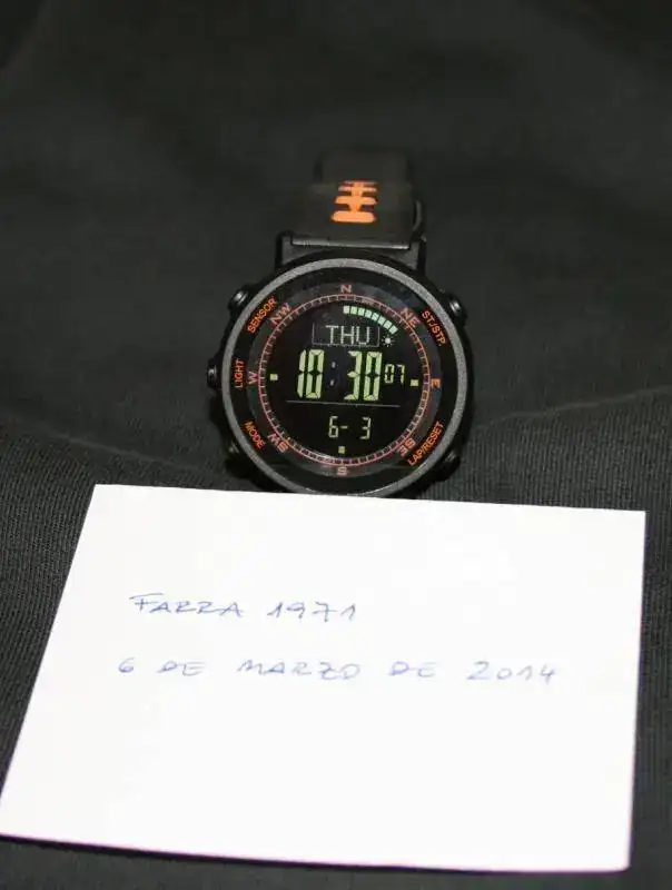 Reloj Digital Latitude Weather Master. Nuevo. Temperatura, Altímetro,Barómetro, Compas, dos alarmas, aviso cada hora, cronómetro, cuenta atrás, doble horario y medición de paso (PACER). Medias 5mm x 1,8mm. Resistente al agua 5 ATM. Modo de apagado de ahorro de batería e indicador de baja batería. Viene con instrucciones. Precio 90 euros. El reloj es espectacular, nada que envidiar a los finlandeses.