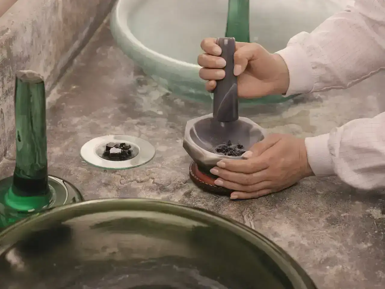 El esmalte se compone de una mezcla precisa de sílice, minio, potasa y sosa, finamente molidos en polvo y combinados con óxidos metálicos para lograr su matizada tonalidad. Se aplica de forma cuidadosa en capas sobre la esfera y luego se cuece a unos 800 °C en un horno —proceso que se repite de cinco a diez veces— para conseguir una superficie luminosa e impecable. Debido a lo imprevisible de este proceso, algunas esferas se rechazan por presentar ligeras imperfecciones. En cambio, las que sobreviven se convierten en obras maestras perdurables, inmunes al paso del tiempo, a la decoloración o al envejecimiento. Un motivo de rayos de sol flinqué bajo la capa de esmalte translúcido aumenta el encanto de su sutil color gris azulado, revelando tanto el brillo de la esfera como su sensación de profundidad.