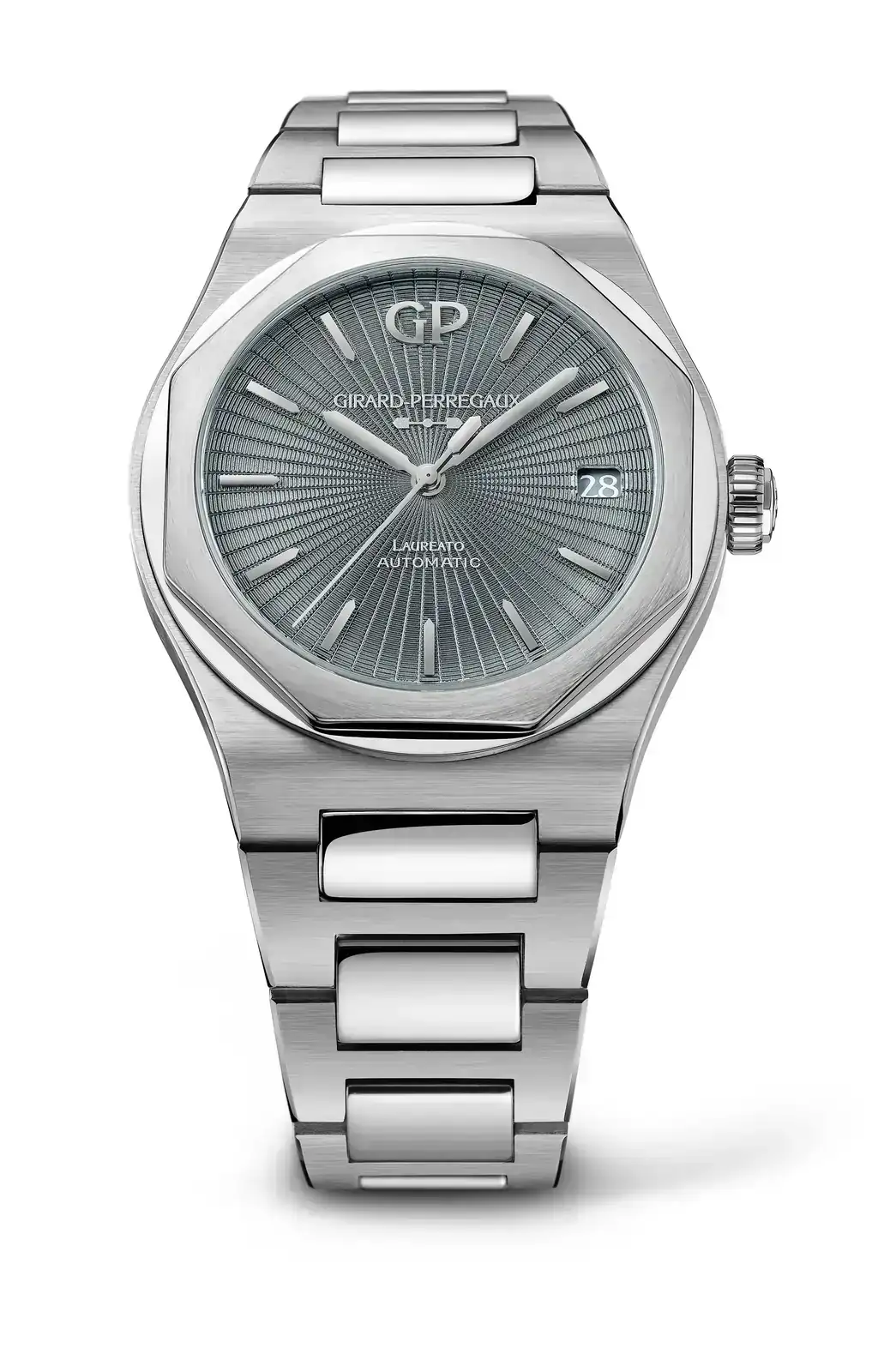 Gracias a su perfil estilizado y a su brazalete integrado, el Laureato es conocido por su excepcional comodidad y su estilo atemporal. Las agujas de tipo bastón chapadas en rodio marcan las horas y los minutos, mientras que el esbelto segundero central incorpora un contrapeso inspirado en el emblemático puente de oro Girard-Perregaux. La ventana de fecha a las 3 presenta números blancos sobre un disco de color a juego con la esfera.