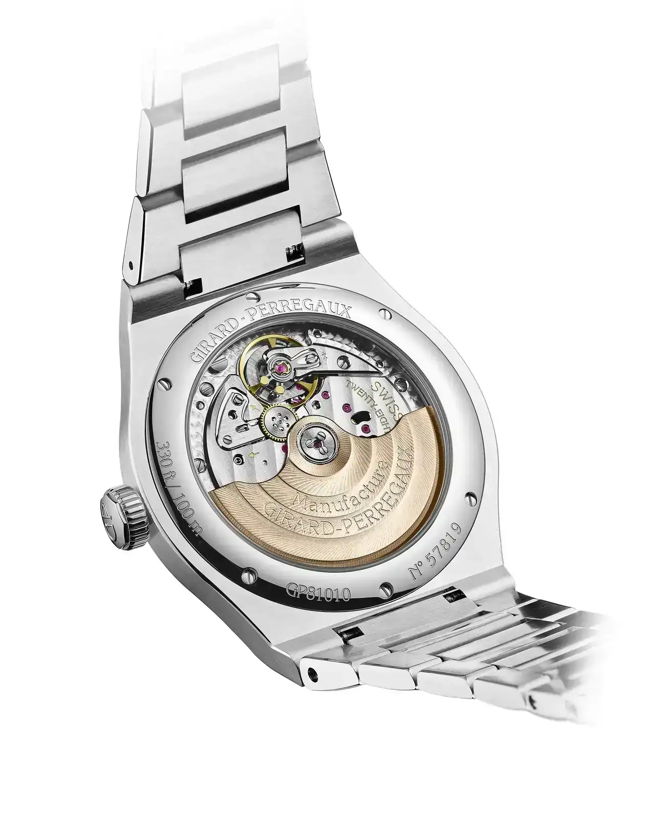 Al igual que el modelo original lanzado en 1975, el nuevo Laureato 42 mm está accionado por un calibre de fabricación propia, el movimiento automático GP01800 en este caso, desarrollado y ensamblado por completo en la Manufactura de La Chauxde-Fonds. Con solo 3,97 mm de grosor, este movimiento de cuerda automática ofrece una reserva de marcha de al menos 54 horas. Los acabados, de Alta Relojería: una masa oscilante de oro rosa adornada con un motivo Côtes de Genève circular, un motivo Côtes de Genève recto en los puentes, tornillos con brillo de espejo, bordes biselados, un graneado circular en la platina y grabados dorados.