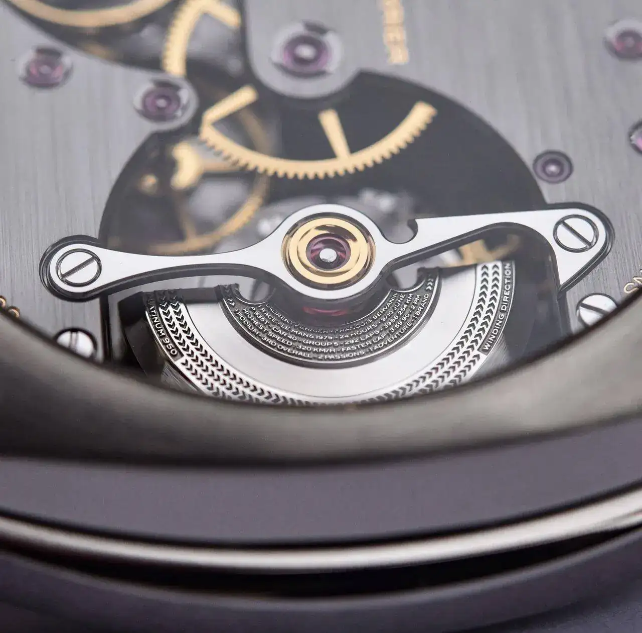 Y siguiendo con la tradición de la marca los acabados son realmente impresionantes recibiendo el calibre la extraordinaria cifra de 139 operaciones de acabado manual. Cada ángulo está incluso pulido de forma excelsa, y los puentes están obsesivamente tratados dando la sensación de que estuvieran hechos de un material de otro mundo. Y si alguien tiene dudas de la meticulosidad de los acabados que le eche un vistazo a la siguiente fotografía del rotor de platino y la amplíe para leer la inscripción microscópica tallada a mano que cuenta la historia del éxito automovilístico de dos amigos allá por 1979. Como no he sido capaz de conseguir una buena macro de mi modelo (mis capacidades fotográficas siguen teniendo limitaciones serias) la foto está sacada de internet.