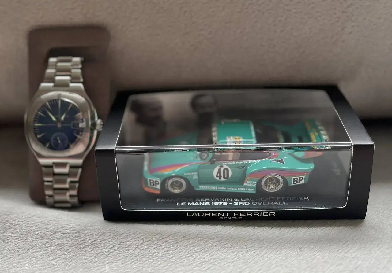 Centrándonos en la creación de este Sport Auto comentar que todo empieza en el año 1979 cuando Laurent Ferrier (en su otra pasión: piloto de carreras) haciendo tándem con su buen amigo Francois Servanin hacen podio en las 24 horas de Lemans justo por detrás del Porsche de un tal Paul Newman. Ese día para celebrar el tercer puesto conseguido, Laurent regaló a su compañero un Nautilus (del cual él mismo era miembro del equipo productor en Patek Philippe). Y a cambio Francois le dijo que un día seguro tendrían sus propios relojes. 30 años después ambos fundaron la actual fabulosa manufactura denominada Laurent Ferrier. Laurent le daba el nombre y el conocimiento relojero, y Francois (actual presidente de la compañía) le daba el músculo financiero y el saber llevar una empresa. Cuando vieron que la compañía iba viento en popa hace pocos años, decidieron crear un modelo que reflejara su amistad y recordara ese momento en el que disfrutaron tanto juntos en Lemans. Y de ahí surgió la idea de este maravilloso Sport Auto.