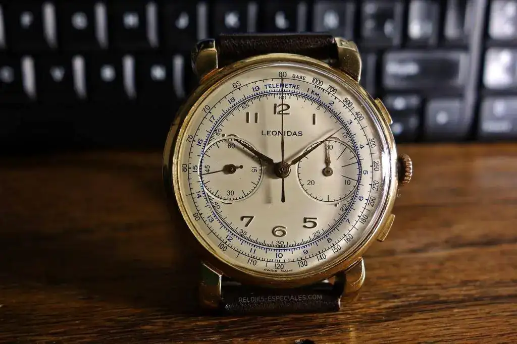 La compañía Leonidas, en Saint-Imier era la competencia de Heuer en cronógrafos de mano y de pulsera, sobre todo en el mercado americano. En 1962, un joven Jack Heuer le propuso al único accionista de Leonidas, Mr. Charles Jeanneret, a la sazón con 70 años y sin continuidad familiar (su único hijo era médico en Lausana y no tenía ningún interés en la relojería), le propuso, digo, la fusión de ambas empresas, que se materializó el once de febrero de 1964 y dio origen a la Heuer-Leonidas S.A. Así pues, este crono debe ser de finales de los 50, supongo