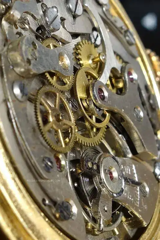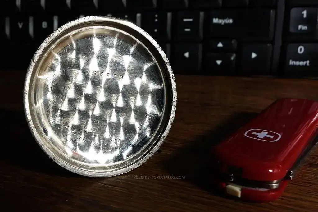 Decía lo de sin vergüenza porque doy por hecho que está restaurado todo él, y no me siento mal por eso. Viendo la corona y los pulsadores uno puede hacerse idea de lo que ha vivido y trabajado, de manera que mejor así. Por otra parte, tengo al impresión de que la restauración ha sido bastante respetuosa con el original.