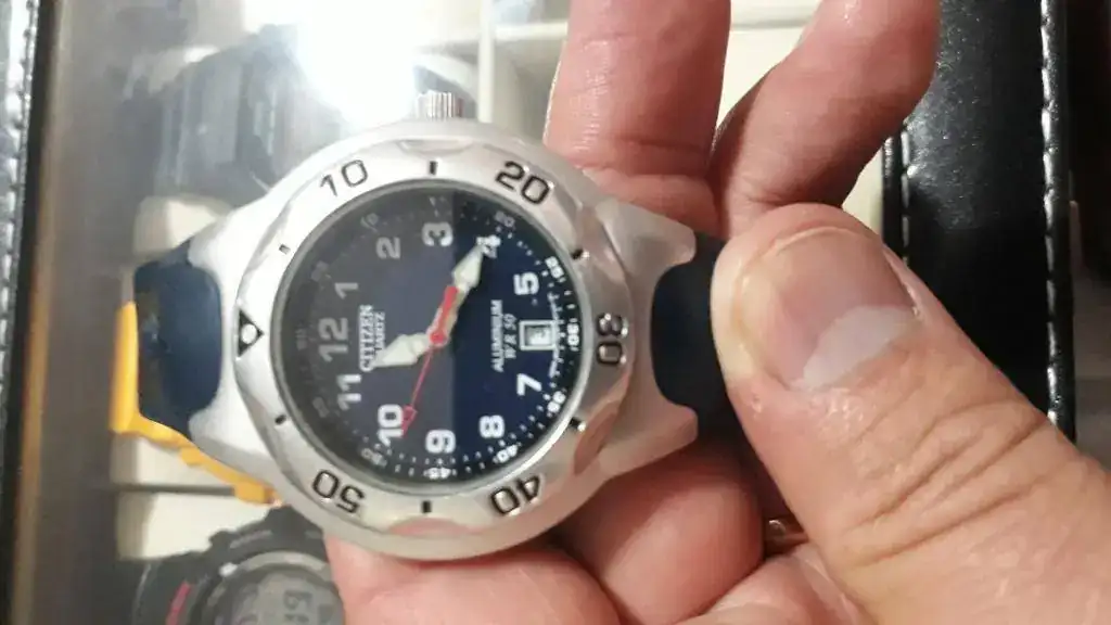 Seguimos con un Citizen, solo se que se puede encontrar en internet como WR 50, es de aluminio, no recuerdo la fecha de compra y como anécdota sus manecillas se soltaron, un relojero no muy pulcro las instalo y las dejo desalineadas, cuando lo abrí vi que tenia una maquinaria Miyota, por mejor lo lleve a la Citizen en Chile y el técnico no lo quiso reparar ya que según el la maquinaria había sido cambiada, después de leer un poco me da la sensación que el relojero no sabia mucho de las maquinarias que monta Citizen, en fin espero que un buen relojero me pueda alinear las manecillas...