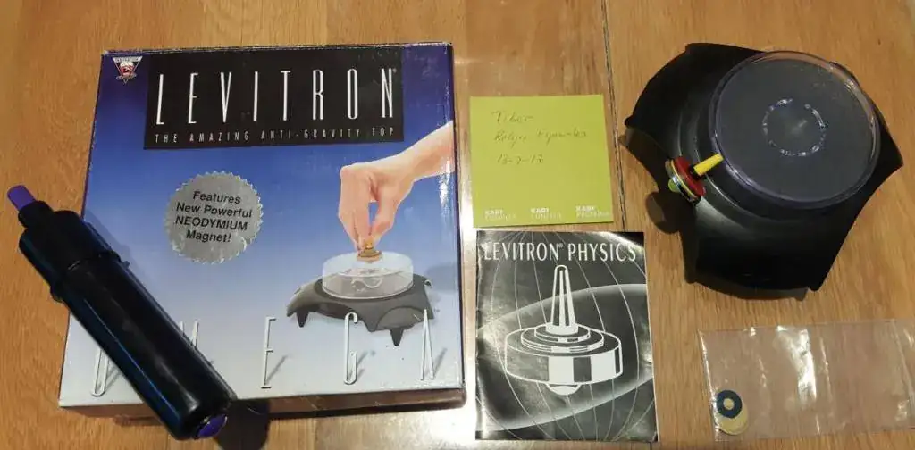 Un delicado equilibrio entre un campo magnético y la fuerza de la gravedad. Pero muy delicado. El campo magnético debe estar perfectamente vertical (y no se ve); la masa de la peonza debe estar en un +/- 0.3%. La peonza debe girar entre 20 y 30 revoluciones por segundo, por encima o por debajo es inestable. Pero cuando se consigue es como si se hubieran puesto todos los astros en conjunción. Ayuda un extra que lleva, un arrancador de la peonza. Porque girar la peonza a mano, con un imán de neodimio debajo....eso es para nota. Caja original e instrucciones. Peso, 1Kgr.